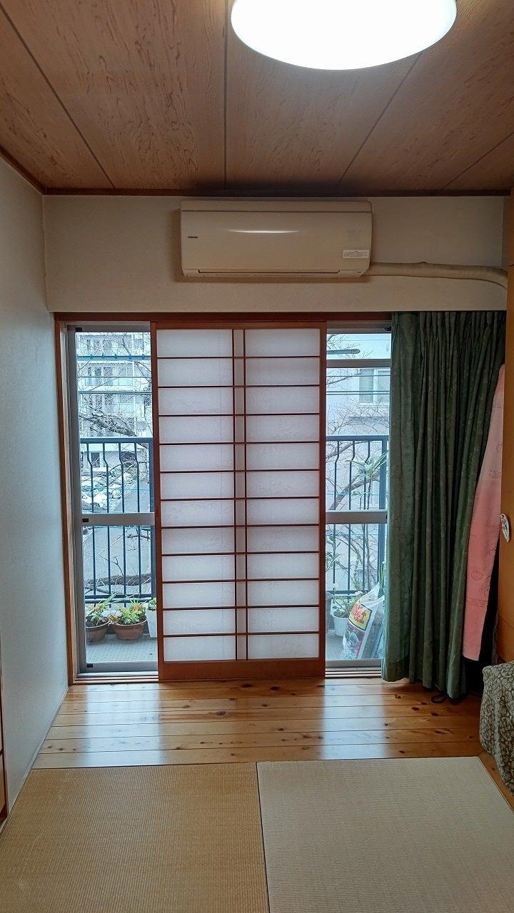 今回施工の内窓は障子を撤去して、その部分に透明ガラスの内窓を設置します。となると部屋は丸見え。今現在のカーテンだと0か、100かになってしまいます。