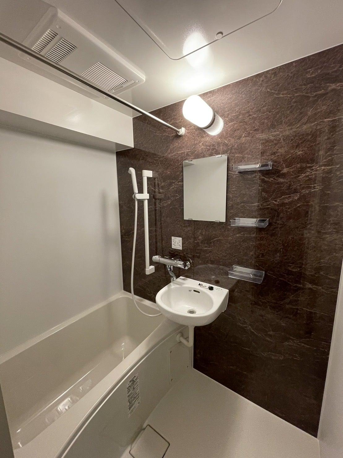 新しくなったお風呂は高級感溢れるブラウンの石目調のアクセントパネル。