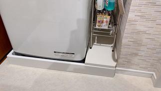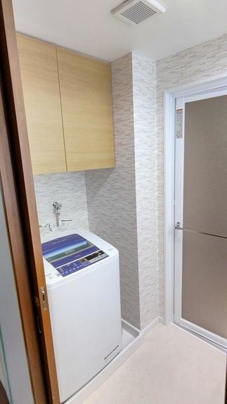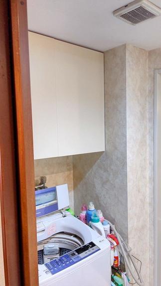 また、脱衣場を挟んだ洗面台の反対にある洗濯機の水栓や防水パンを新しくしました。吊戸は既存品ですが扉にシートを貼り、洗面台扉に合わせさせていただきました。