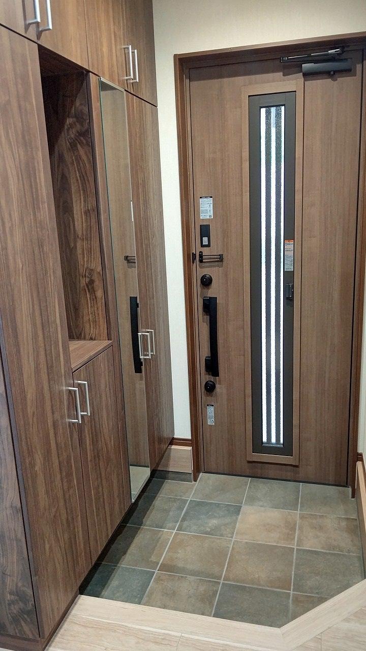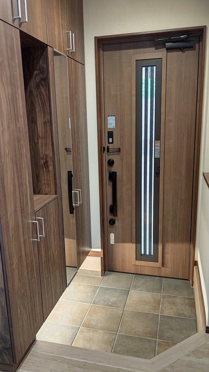新しい玄関ドアはLIXILのジエスタ2。電動の施開錠タイプ&ナンバーキー対応がご希望でしたので、リフォーム用だとないタイプだった為、新築用の玄関ドアで提案させていただきました。