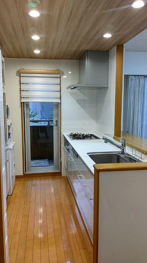 新しいキッチンはLIXILノクト。一年半前に交換されていたコンロと換気扇は流用させていただきました。内装は照明をダウンライトに変更し、天井はS様の憧れの板風天井にする為に木目調クロスにしました。