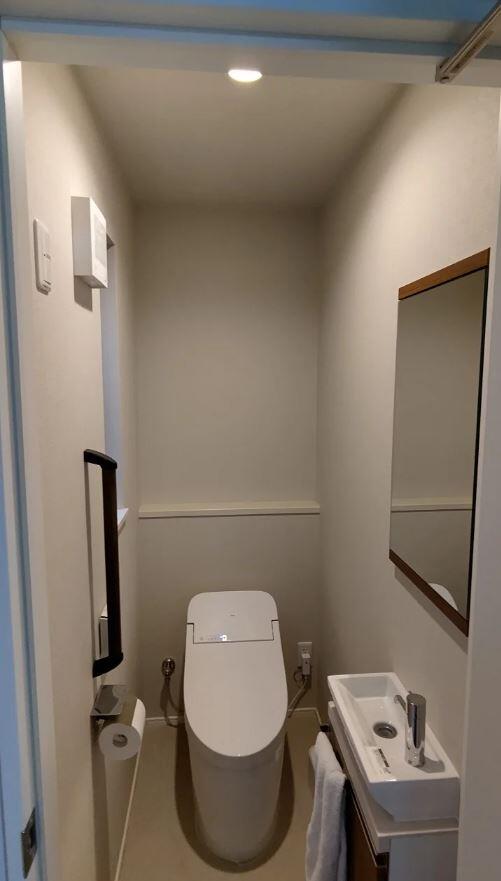 元から設置されていた鏡フレームや手摺、手洗器の扉の色を考慮して、アッパーキャビネットの扉色も選定させていただきました。