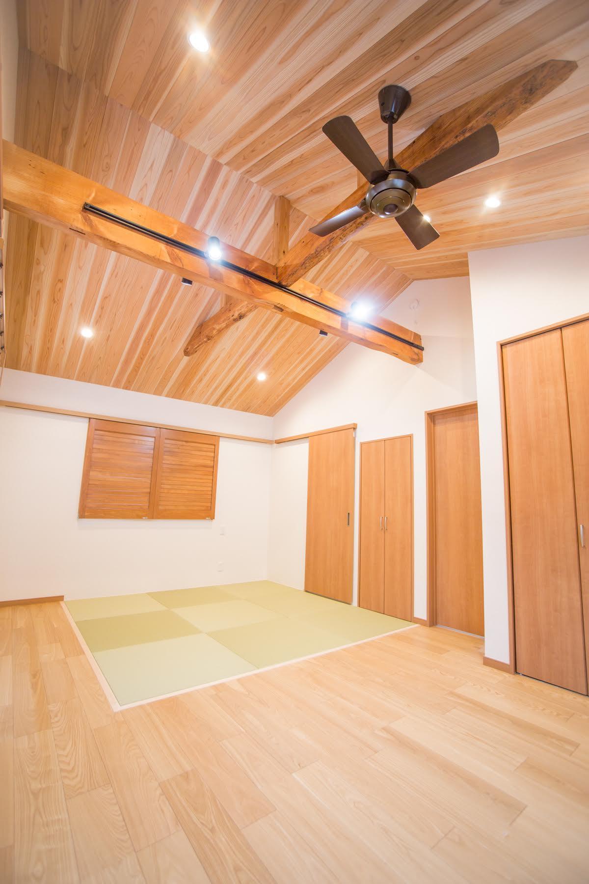 梁を生かして天井が高くなり、すっきりとした空間になりました。畳コーナーでは体操やストレッチを楽しまれるそうです。