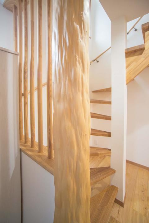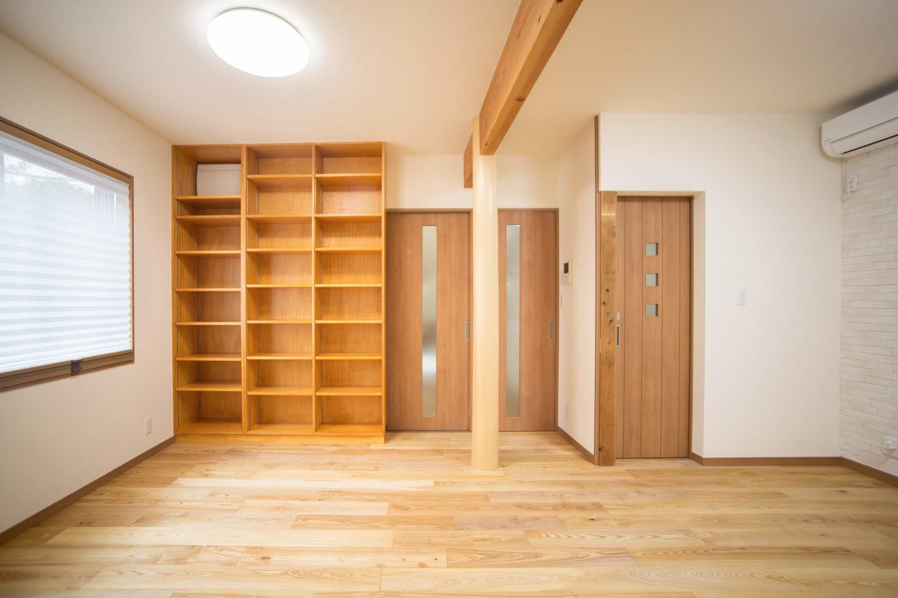 お子様の成長の証を刻んだ柱をそのまま残し、開放的なリビングに生まれ変わりました。大黒柱は奥様がお選びになりました。建具は【ラシッサ】、壁面には作り付けの収納棚、エアコン側にはエコカラットを施工しました。