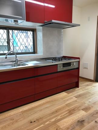 システムキッチン【アレスタ】を採用。奥様のご希望で鮮やかなお色のキッチンになりました。