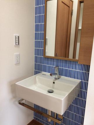 洗面台は【ルミシス】、正面にはタイルを施工しました。