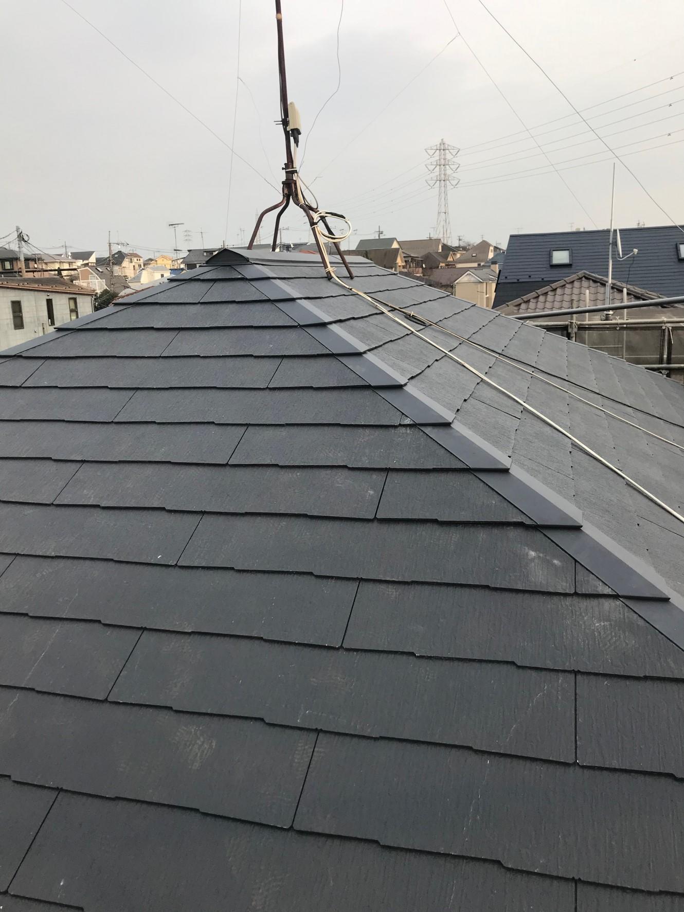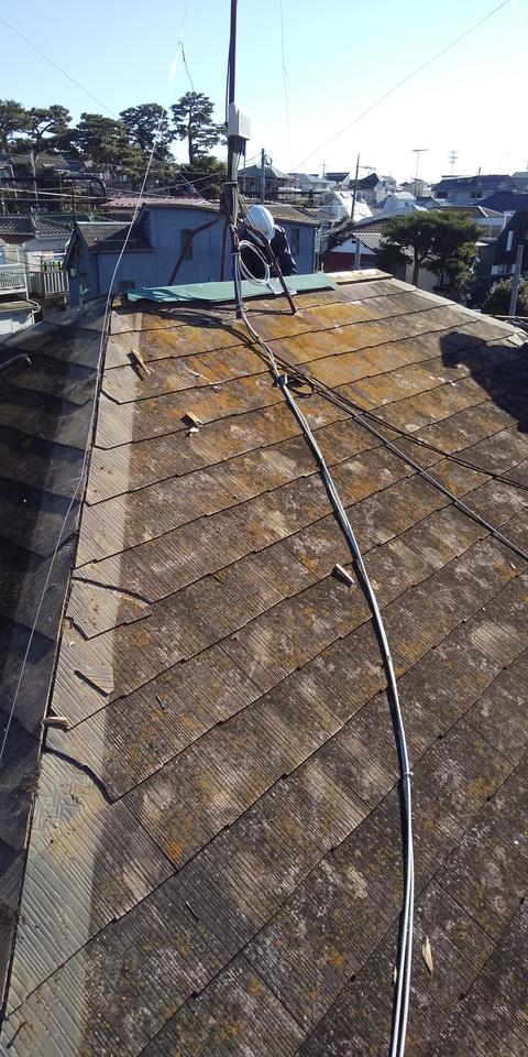 台風の被害で屋根を損傷したため、なるべく早く修理してほしいとのご要望でした。 傷んでいた下地から補修し、以前と同じコロニアル素材で貼りました。テレビのアンテナも古くなっていたので新しく設置し直しました。