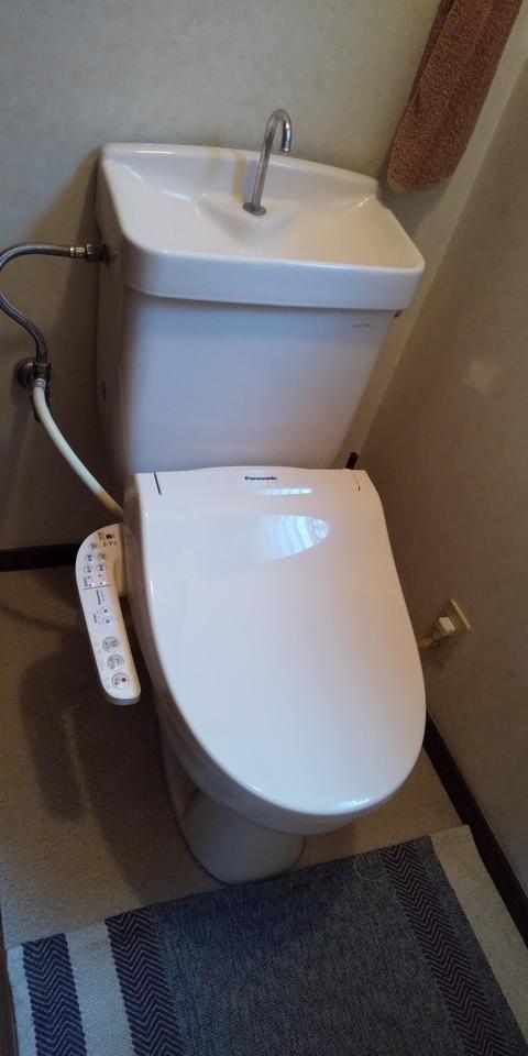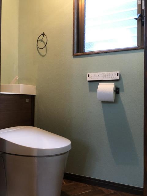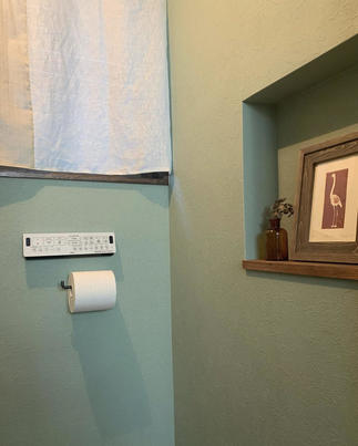 当初はタンクレストイレと独立した手洗い器をご希望されていたのですが、配管と予算の関係でキャビネット付きトイレの【リフォレ】をご提案しました。もともとついていた棚は枠を撤去し、ニッチ風のスペースに。奥様のセンスが光るコーナーになりそうです。