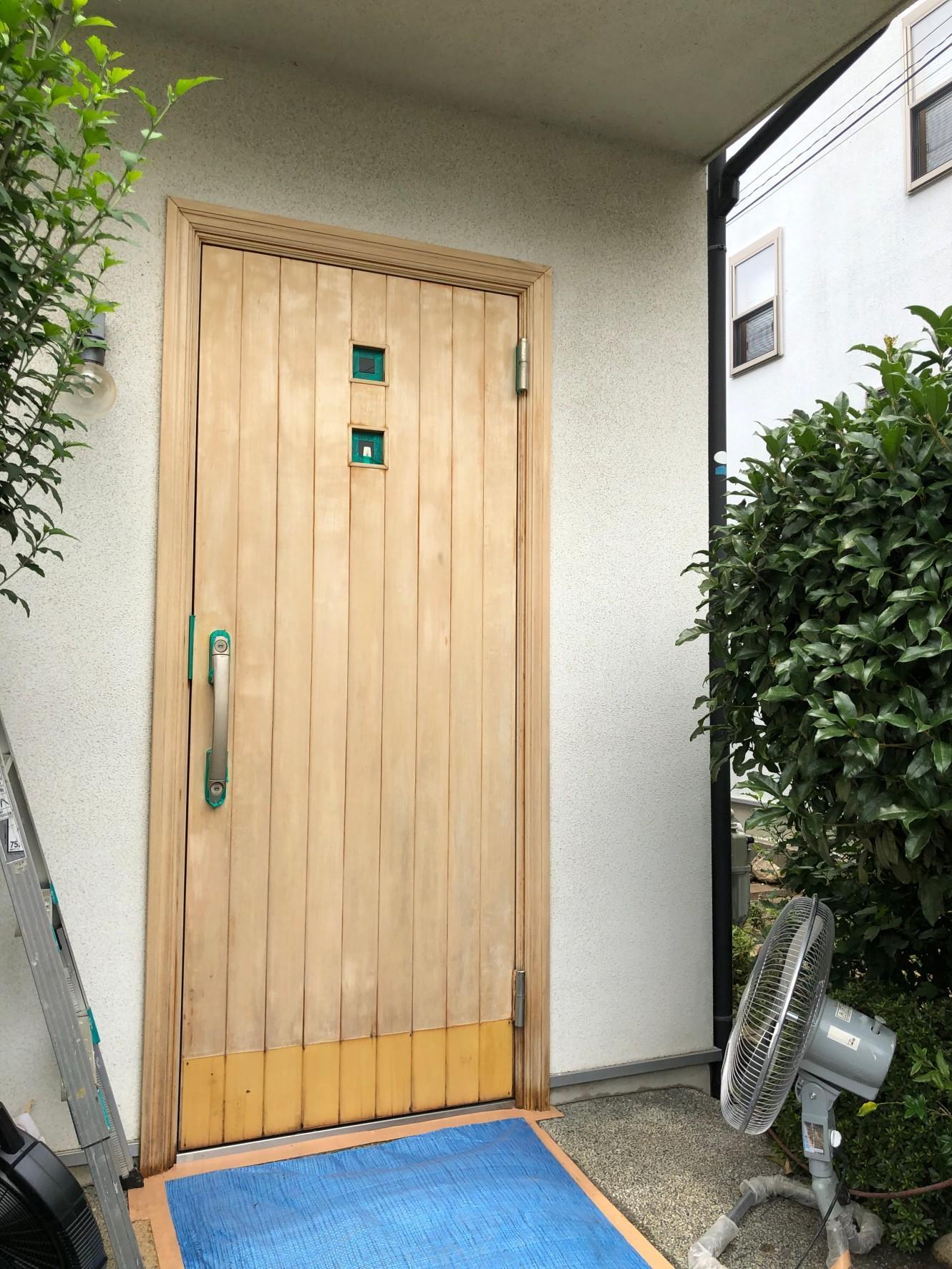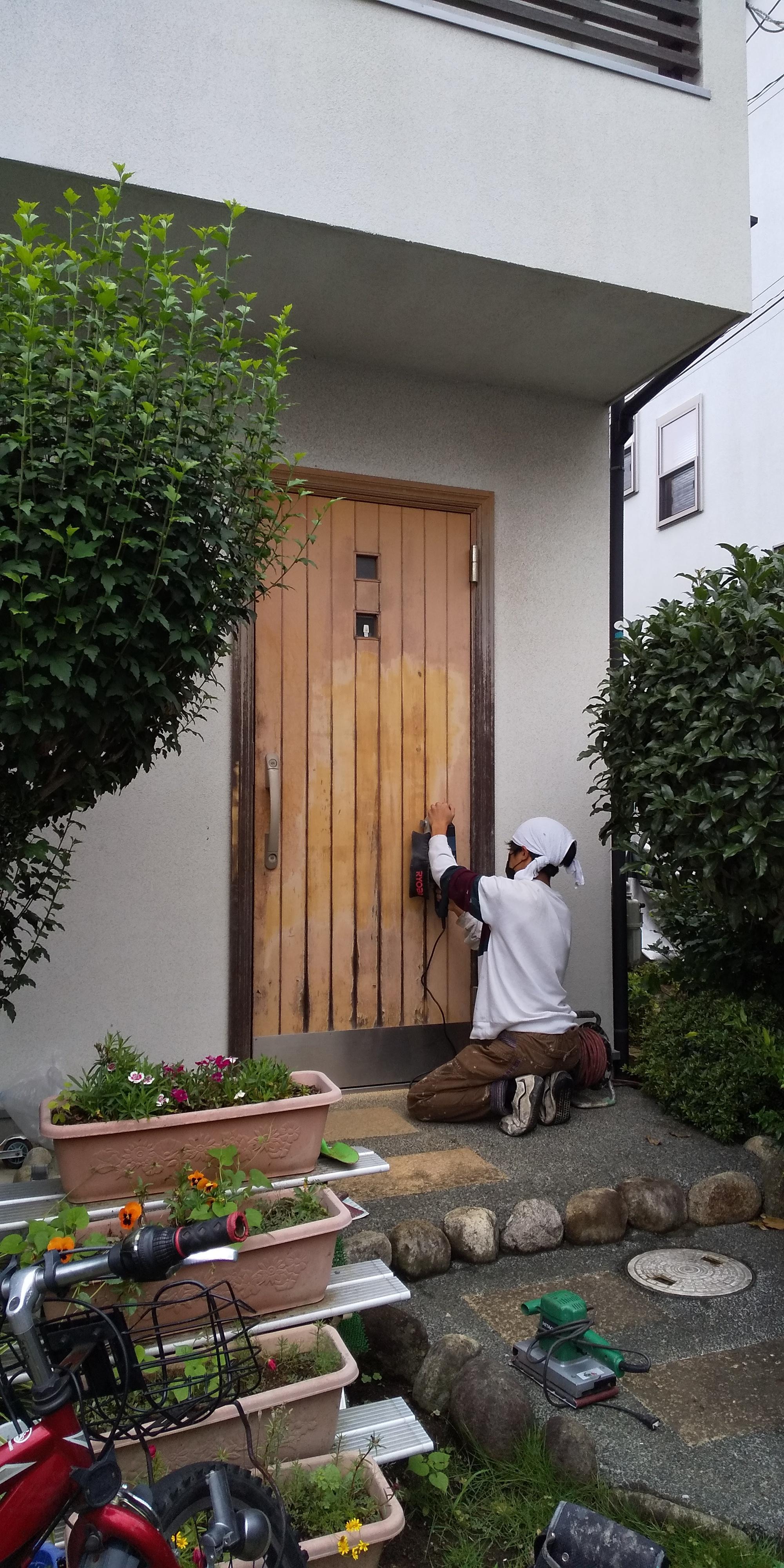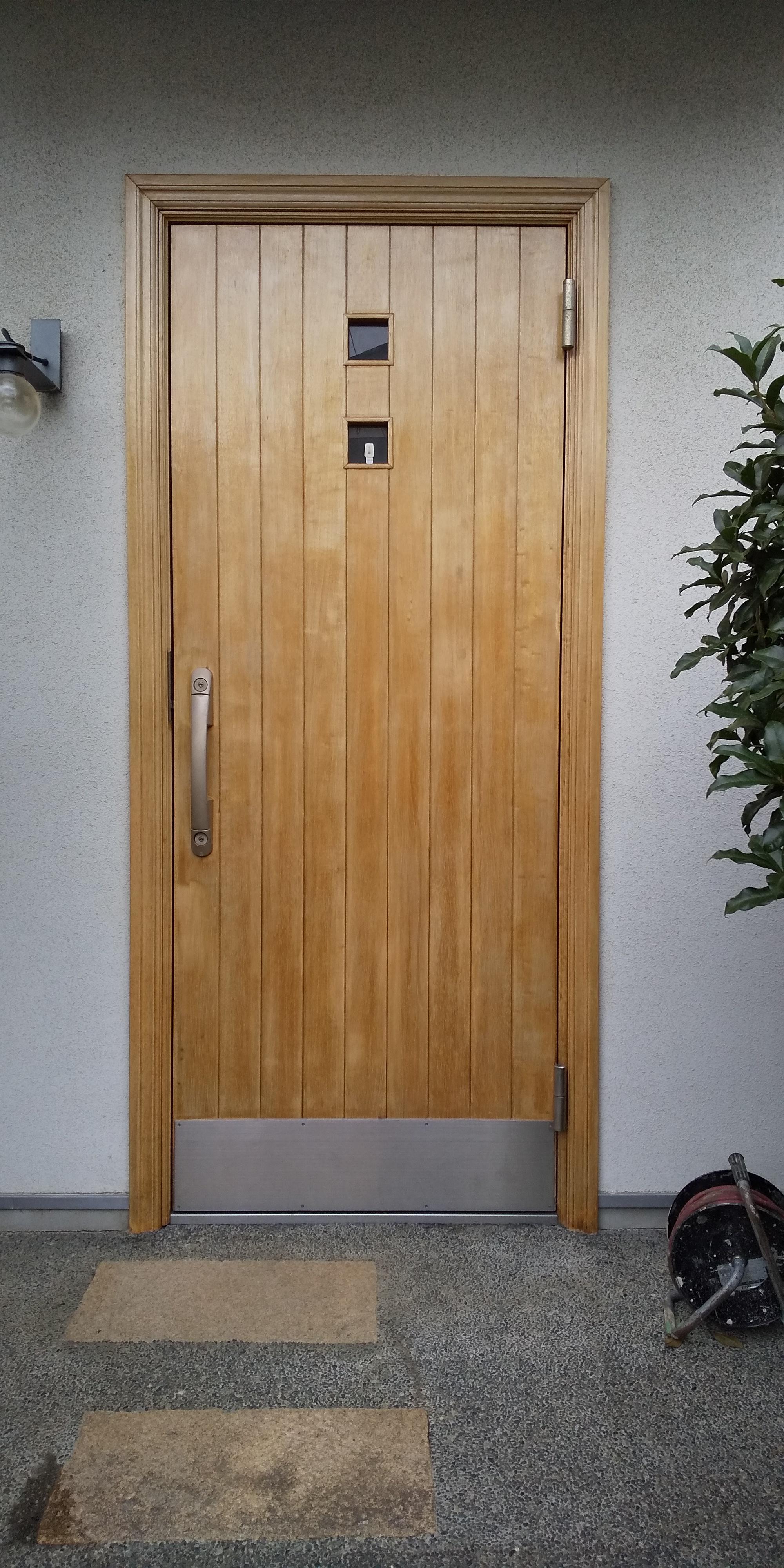 築10年以上、雨風や日光で傷みが目立つようになった玄関ドア。 表面の古い塗装を落とし、きれいにリペアさせていただきました。