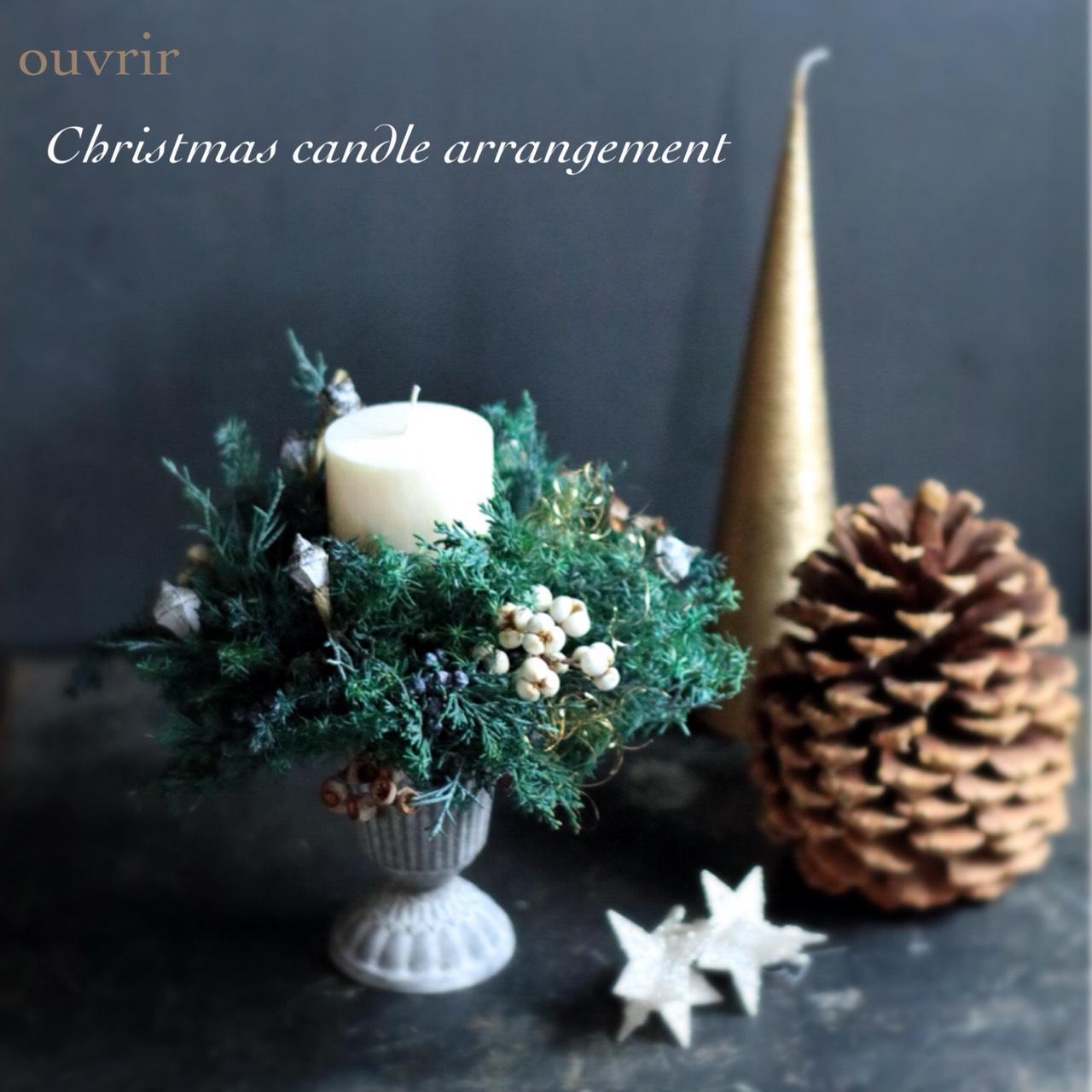 アンティーク風の花器を使って、キャンドルアレンジメントを作成します。フレッシュグリーンを使用し、クリスマスまで楽しんでいただけるアレンジです☆