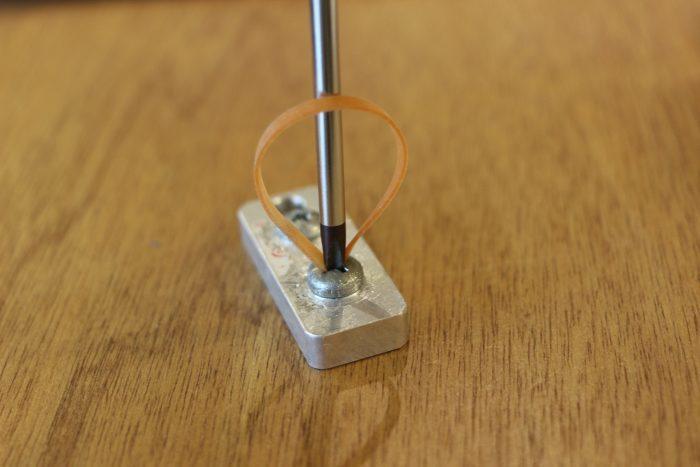 ドライバーと十字穴の間に輪ゴムを挟んで押しながら回すだけなんです。