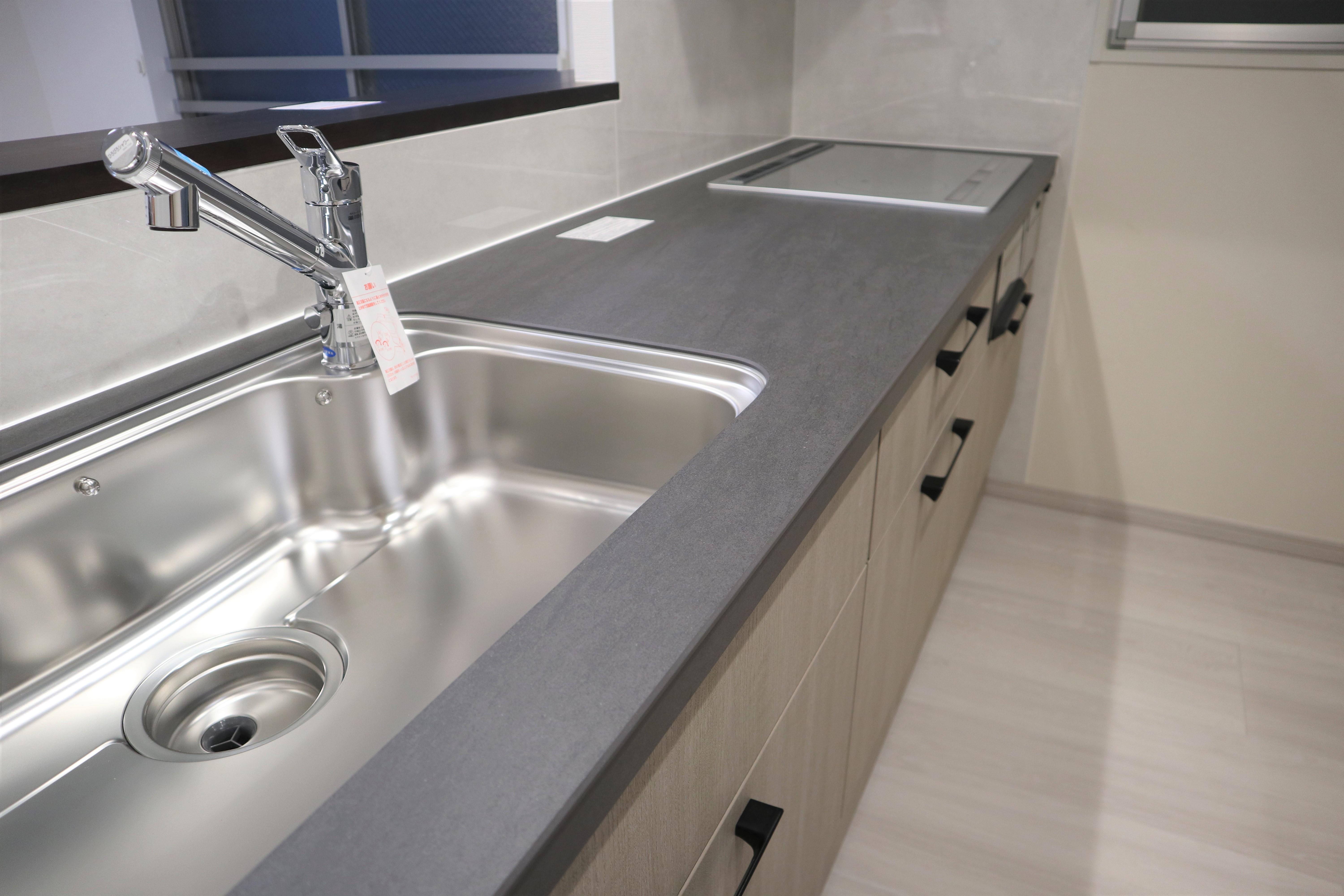 ②ホワイトの木目調にブラックの取っ手でおしゃれなキッチンに!
