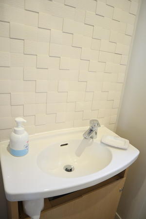 また手洗いの壁面にはLIXILのエコカラットを貼りつけました。