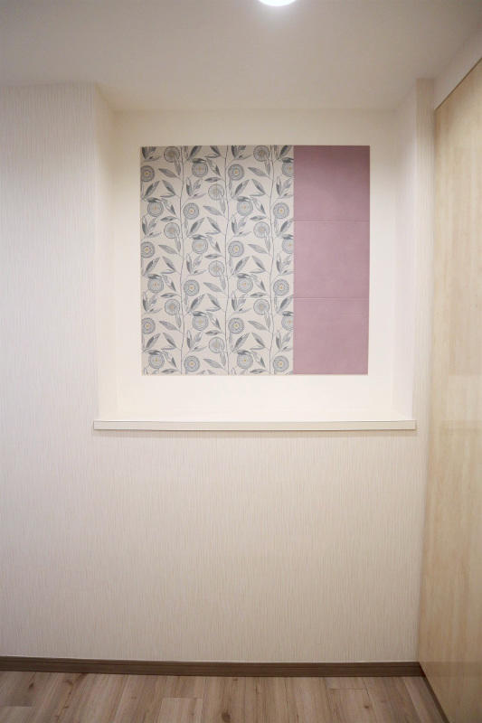 ▲続いてこちらは玄関の施工事例。紫の「フェミーナ」シリーズと柄タイルを組み合わせ、まるで絵画が飾ってあるかのような美しい空間に仕上がっています。
