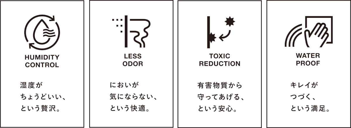 ホルムアルデヒドやトルエンなど。「エコカラットプラス」は、空気中に舞うこれらの有害物質を吸着し、低減してくれる役割も果たします。化学物質に敏感な方には、特にうれしい機能ですね。
