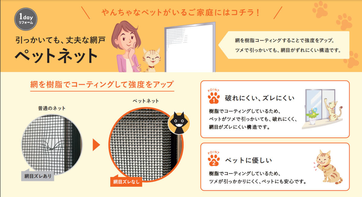 LIXILの「ペットネット」は、網を樹脂コートすることで、強度をアップさせた網戸。猫ちゃんの爪も引っかかりにくく、網ズレも起きにくいので、猫ちゃんが引っかいたり登ったりして破れた!という事態を防ぐことができます。