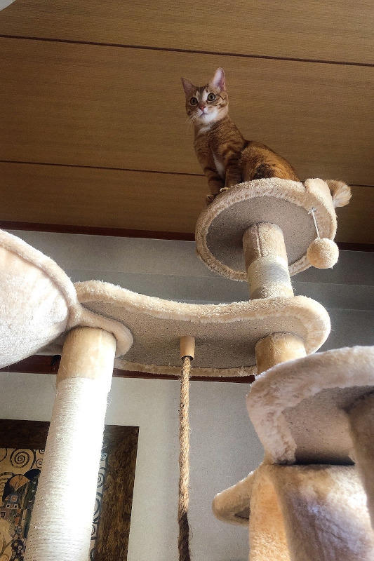 猫たちにとっては、地面を走り回る平面的な動きより、高いところに飛びあがったりする上下運動のほうが運動としては効果的だと言われています。これは、猫たちの祖先が木の上で暮らしていたときの名残だという説も。