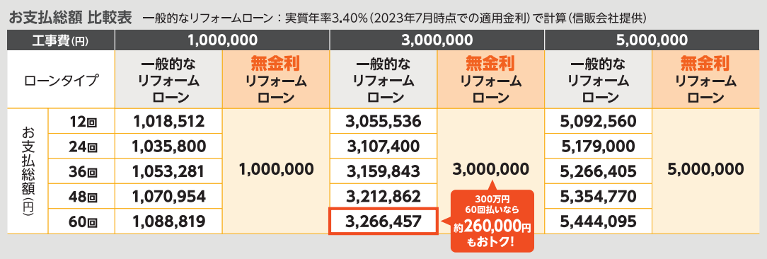 水回りやLDKをリフォームするのに300万円かかるとして、60回払いのローンを組んだ場合、通常のLIXILリフォームローンではお支払い総額が326万6457円(※)かかるところ、このキャンペーンを利用すればきっかり300万円と、トータルで約26万円もお得に!