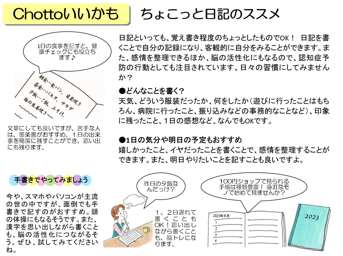 今や、スマホやパソコンが主流の世の中ですが、面倒でも手書きで記すのがおすすめ。頭の体操にもなるそうです。