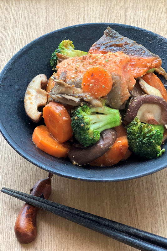 ①鮭は3センチほどに切る。舞茸は大ぶりに手でさき、ニンジンは皮をむいて1センチの輪切りにする。しいたけは茎を切り落とし、2等分に切る。ブロッコリーは花房に分ける。Aの調味料は合わせておく。