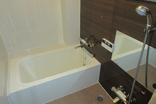 昔ながらのタイル貼りから木目調とクリアなパネルに。浴槽は磨いて塗装仕上げでクリアな白に。リメイクによって浴室全体がスッキリ洗練した雰囲気になりました。