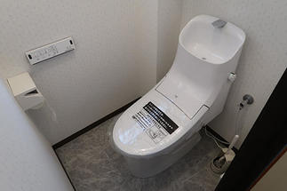 トイレ室もLIXIL製。水道代もお得になる節水型、フチがないフチレスでお掃除もらくらく『アメージュZA』を設置しクロスも貼り替え明るさアップしました。