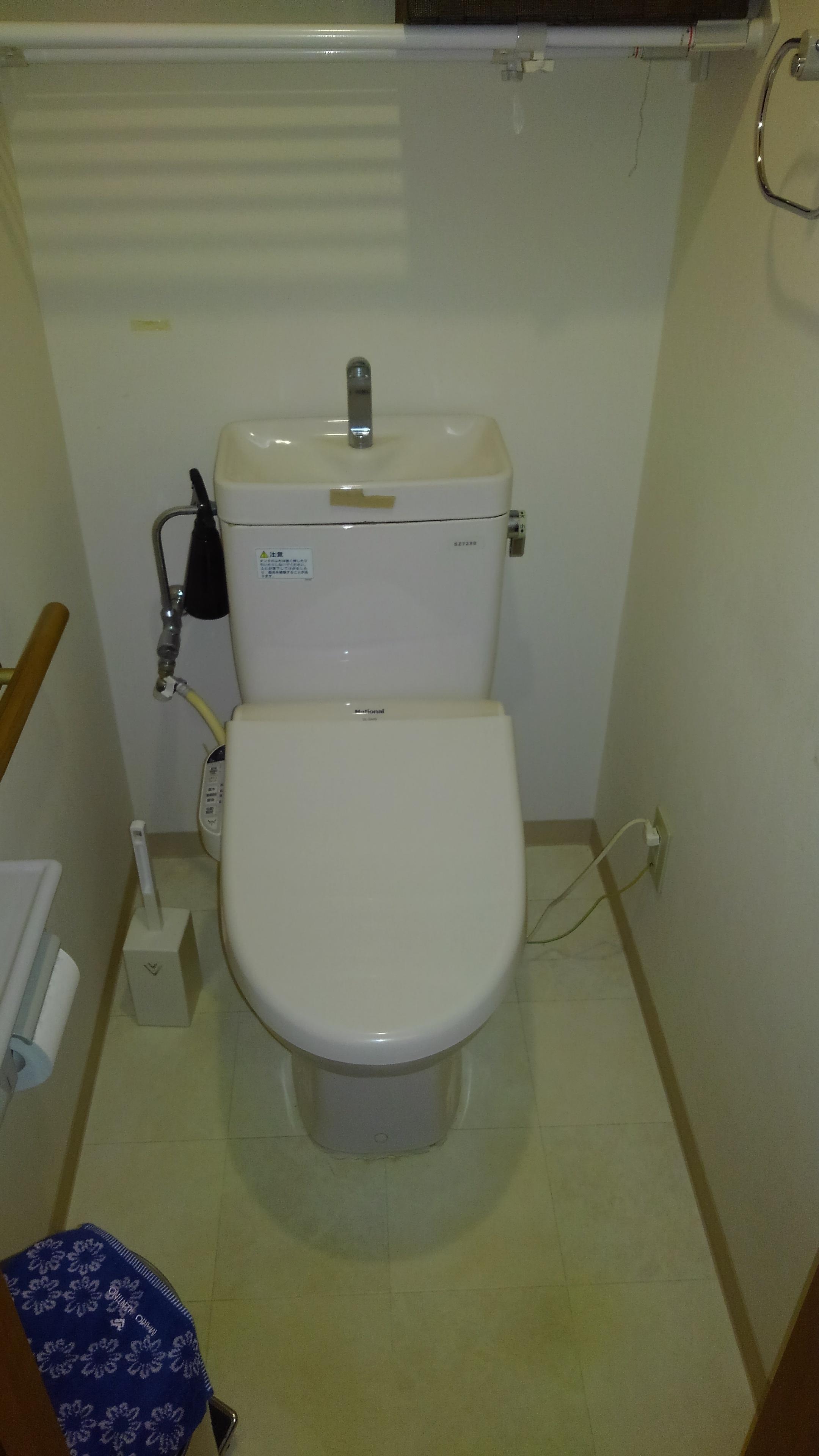 シンプルですっきりキャビネットつきトイレLIXIL製リフォレです 給水管やコードも隠せ床に置きがちなお掃除グッズもしまえて トイレ室がすっきりします