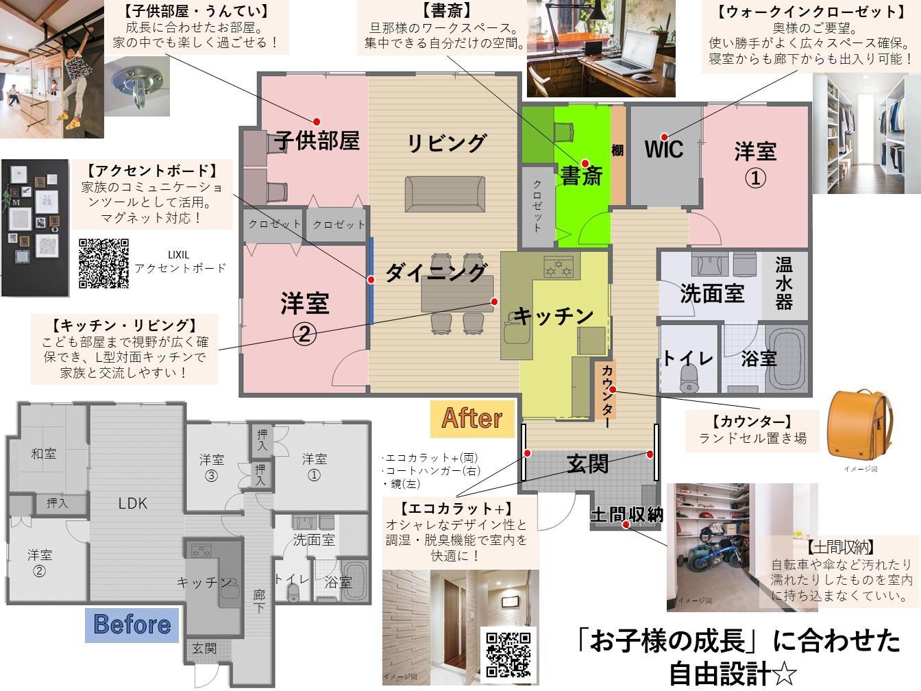 築35年マンションを購入されリノベーションを希望されたK様。土間収納・ランドセルカウンター・書斎・ウォークインクローゼット・オープンキッチンとお施主様のご希望をたっぷりと詰め込みました。リビング学習ができる子供部屋は、成長に合わせて間仕切り壁を設置し一人一部屋用意できるプランに。水回りの設備はLIXILの「シエラ」「リノビオV」「アメージュZA」「L.C.」をセレクト。使い勝手&清掃性がUPして快適なお住まいに生まれ変わりました。