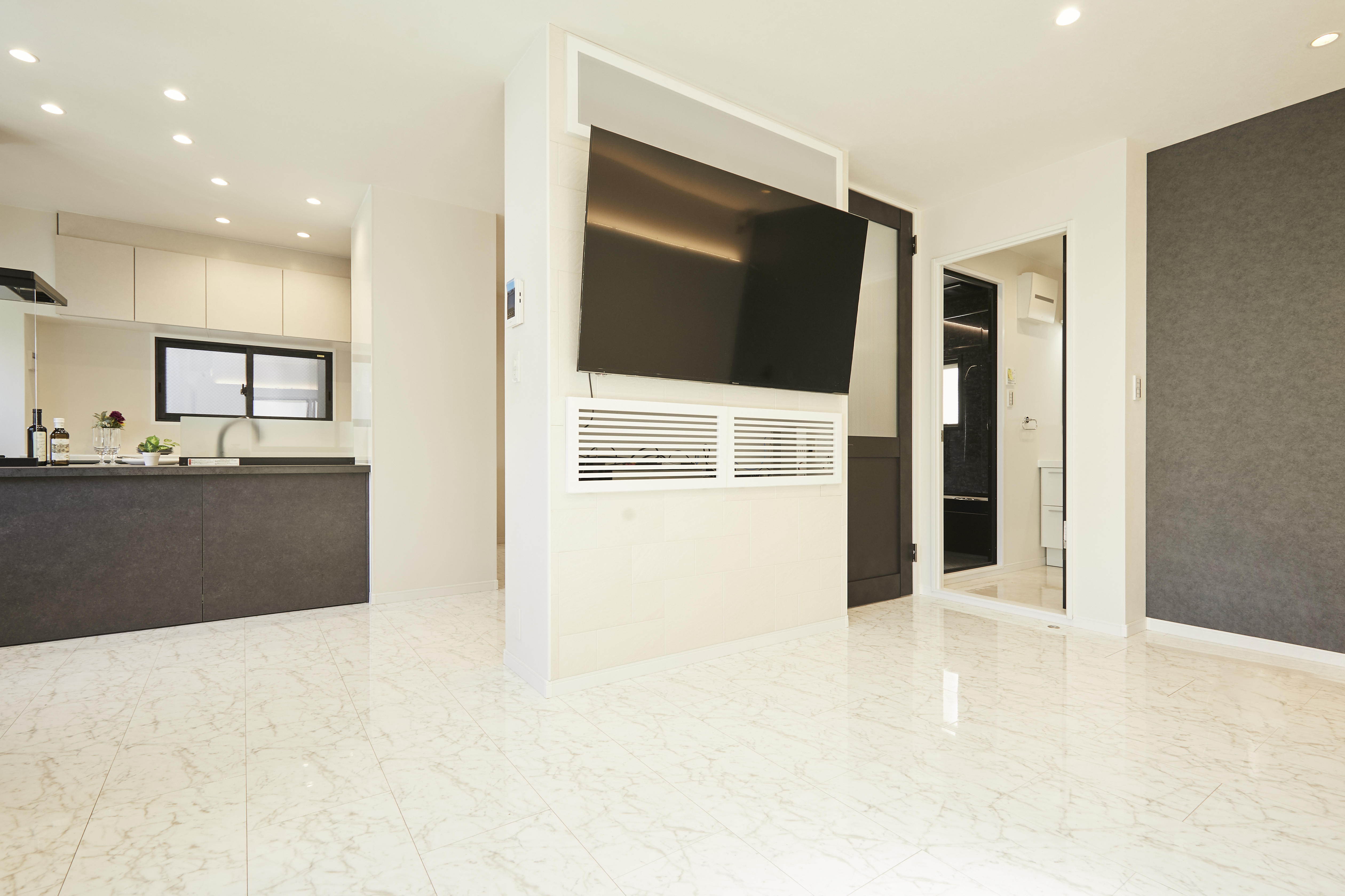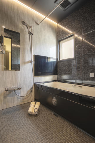 “生活感のないスタイリッシュな空間”をコンセプトにテーマカラーにチャコールブラックとホワイトを選びました。収納を造作しホテルに住まうイメージをご提案。気になる音もインプラスで防音し、断熱効果もUPしました。またLIXILの水回り設備「リシェルSI」「スパージュ」「サティス」「L.C.」は使い勝手・清掃性・デザイン性が高く、快適な生活をお届けしてくれます。