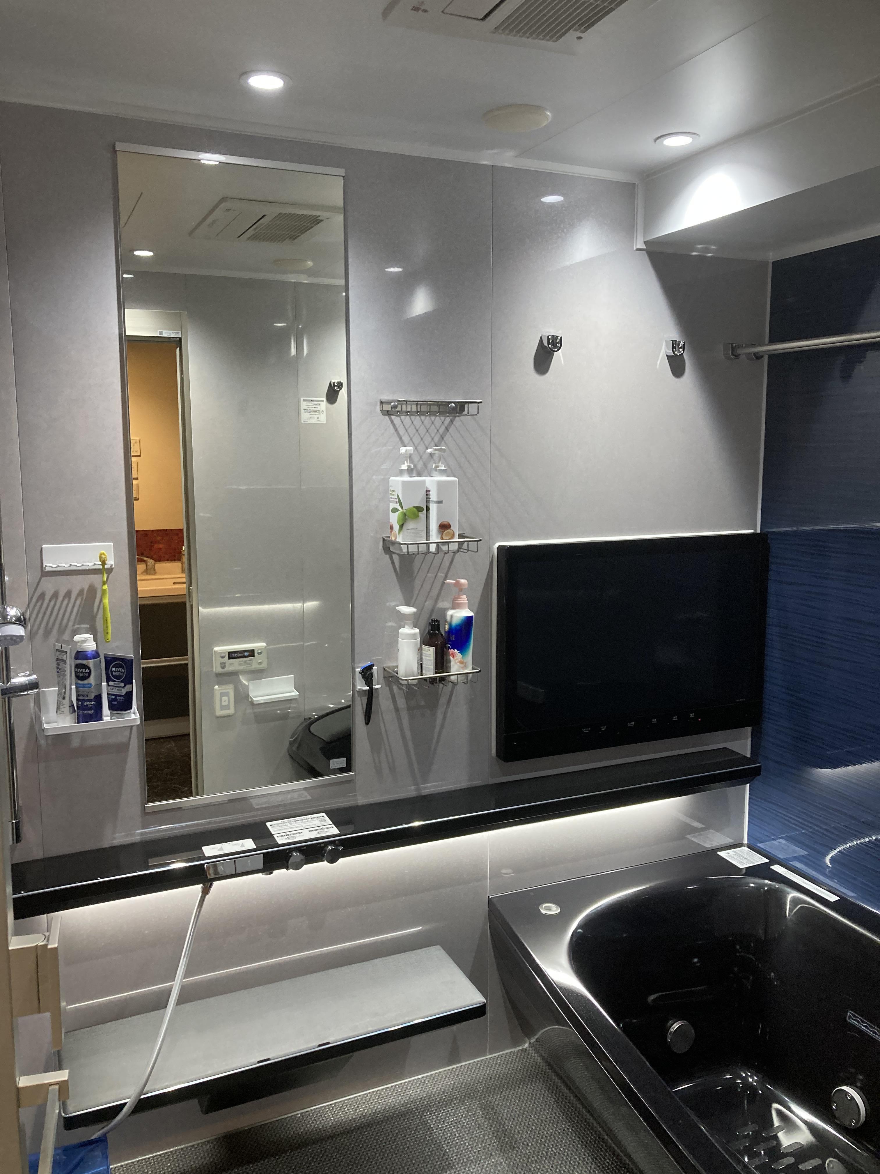 お風呂にゆっくり浸かりながらテレビを見たい、 というご要望がありTOTOの「シンラ」を採用。 シンラに搭載された「楽湯(らくゆ)」なら、 肩も腰もじっくり温めてマッサージしてくれます。 32型のワイドなテレビもお客様のこだわり。 間接照明なども相まって、心身ともにリラックスできる空間になりました。