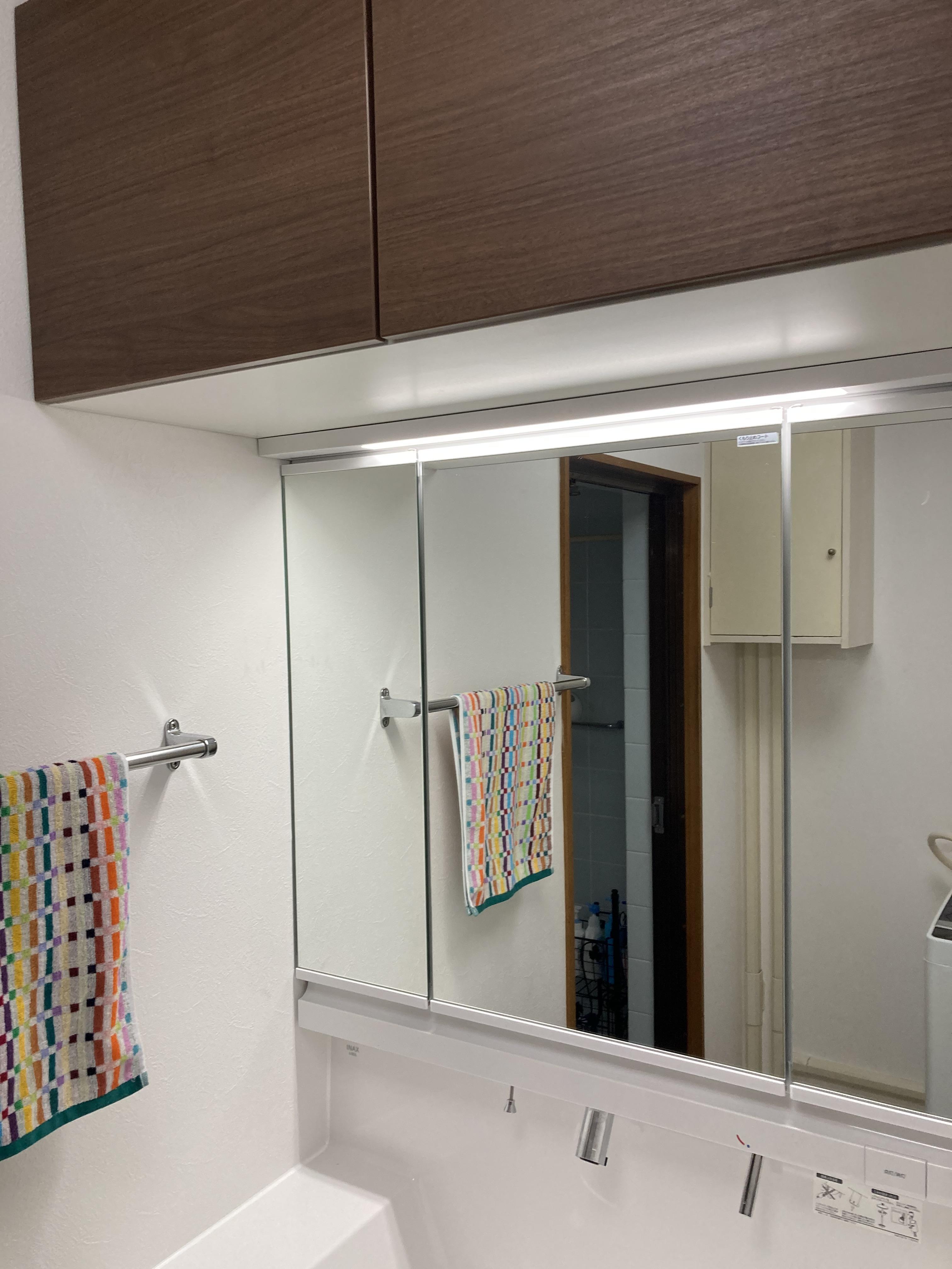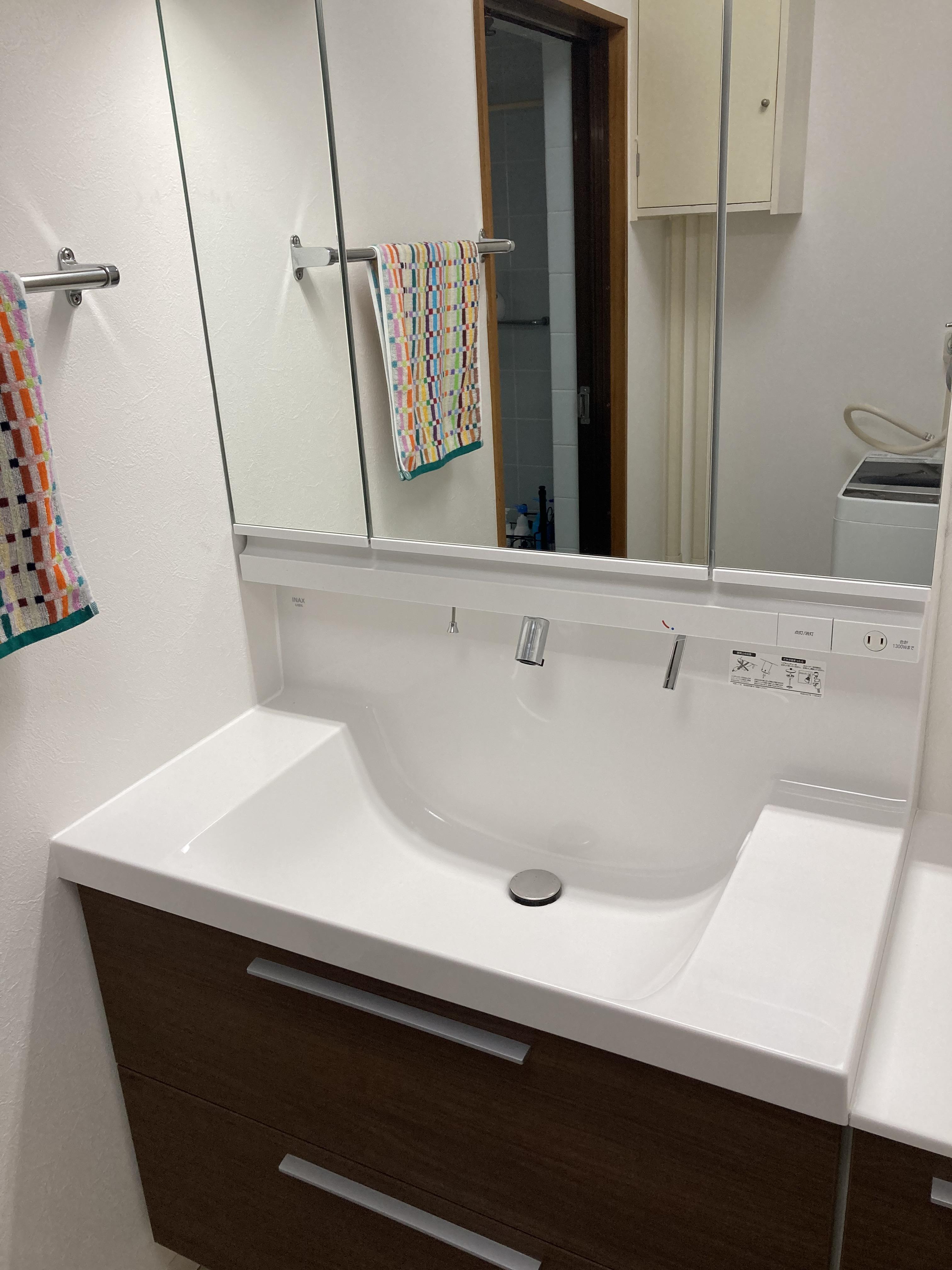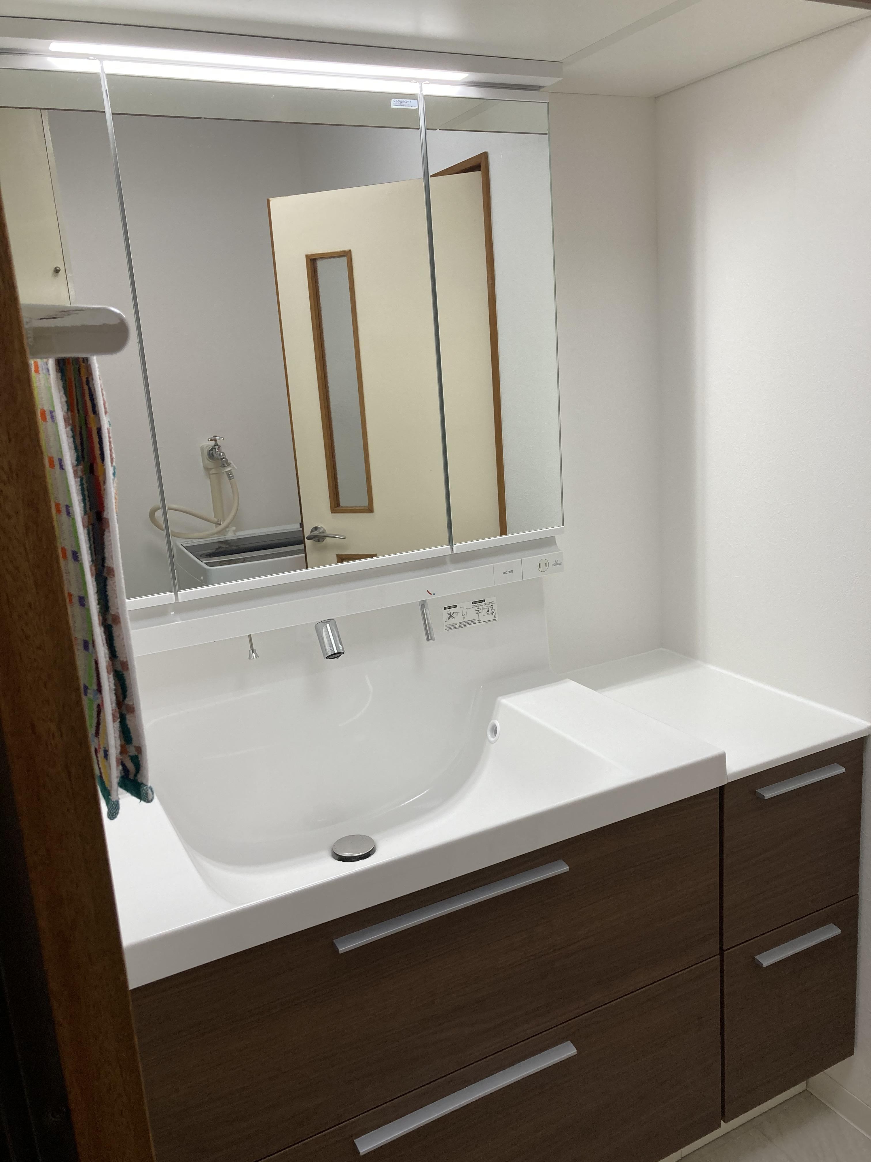 この度はご依頼いただきまして誠にありがとうございました。当初は既存のように洗面台の横にトール収納をつける予定でしたが、カウンターのみにすることで、広くすっきりとした印象になりました。収納場所のご要望は多いですが、スペースによっては圧迫感が出てしまうことも。洗面台一つとっても、その空間に合わせたプランがポイントです。