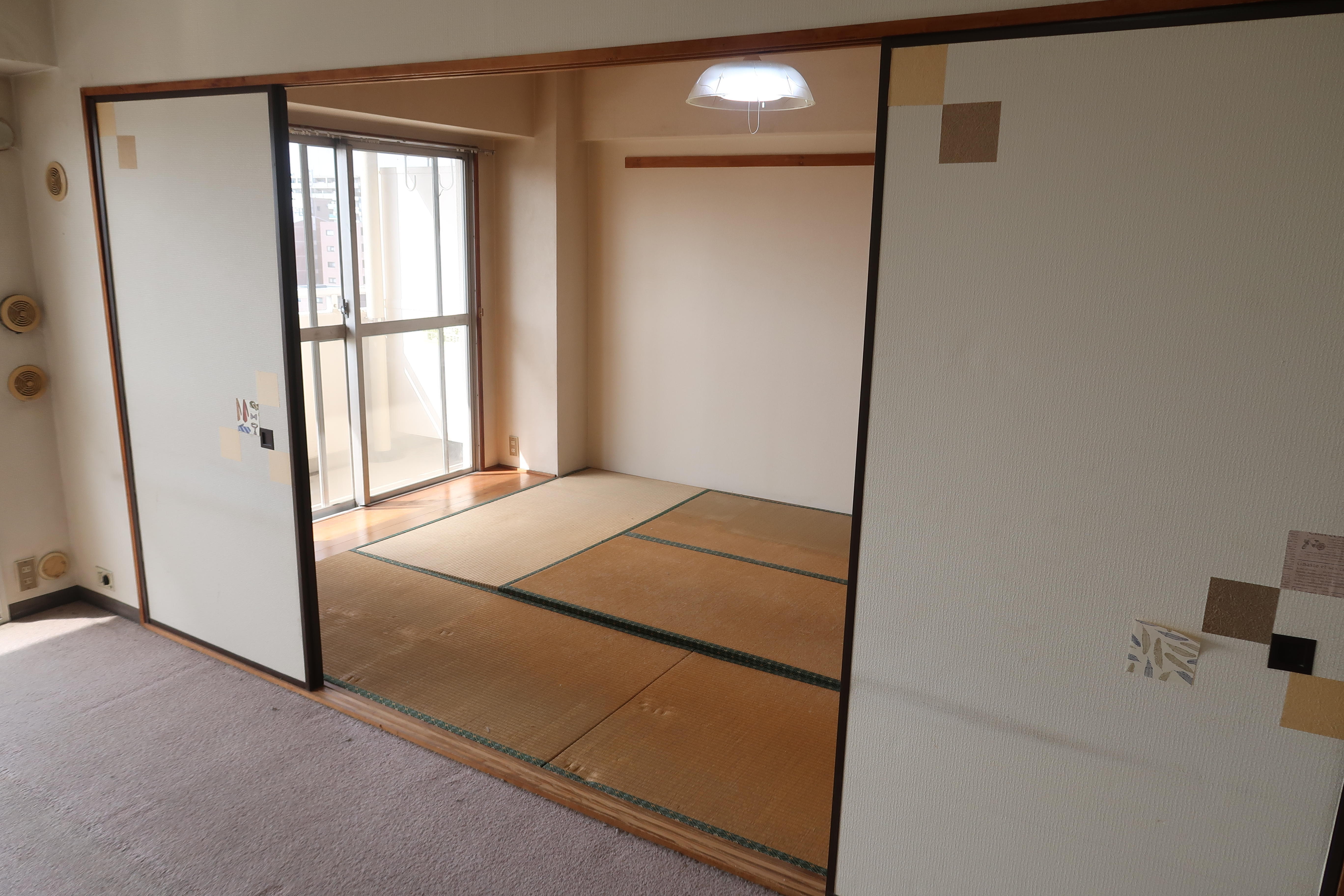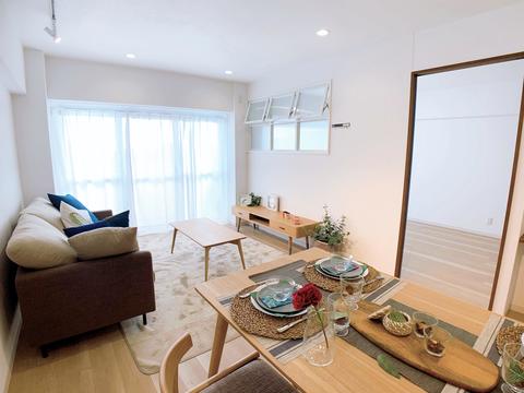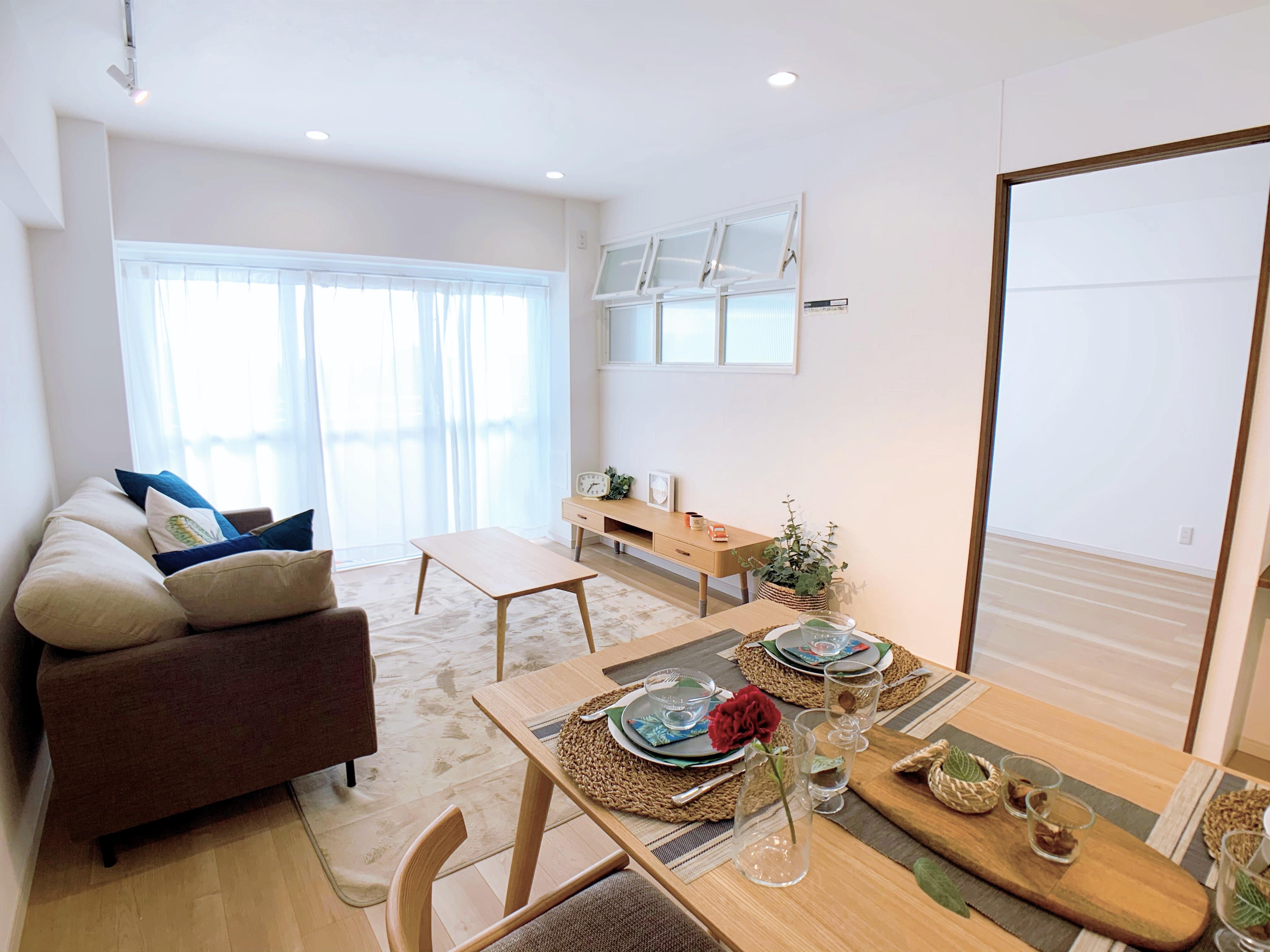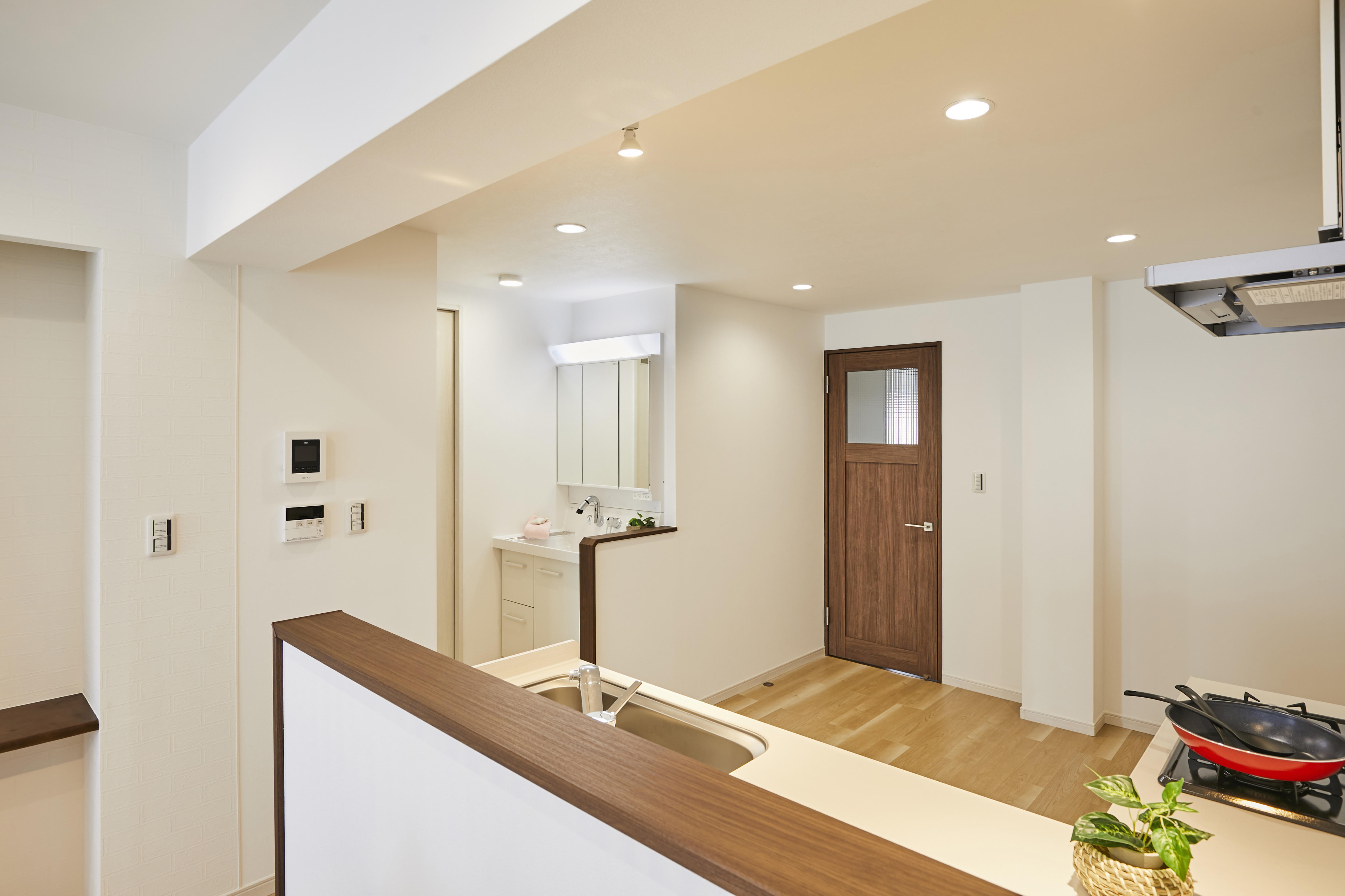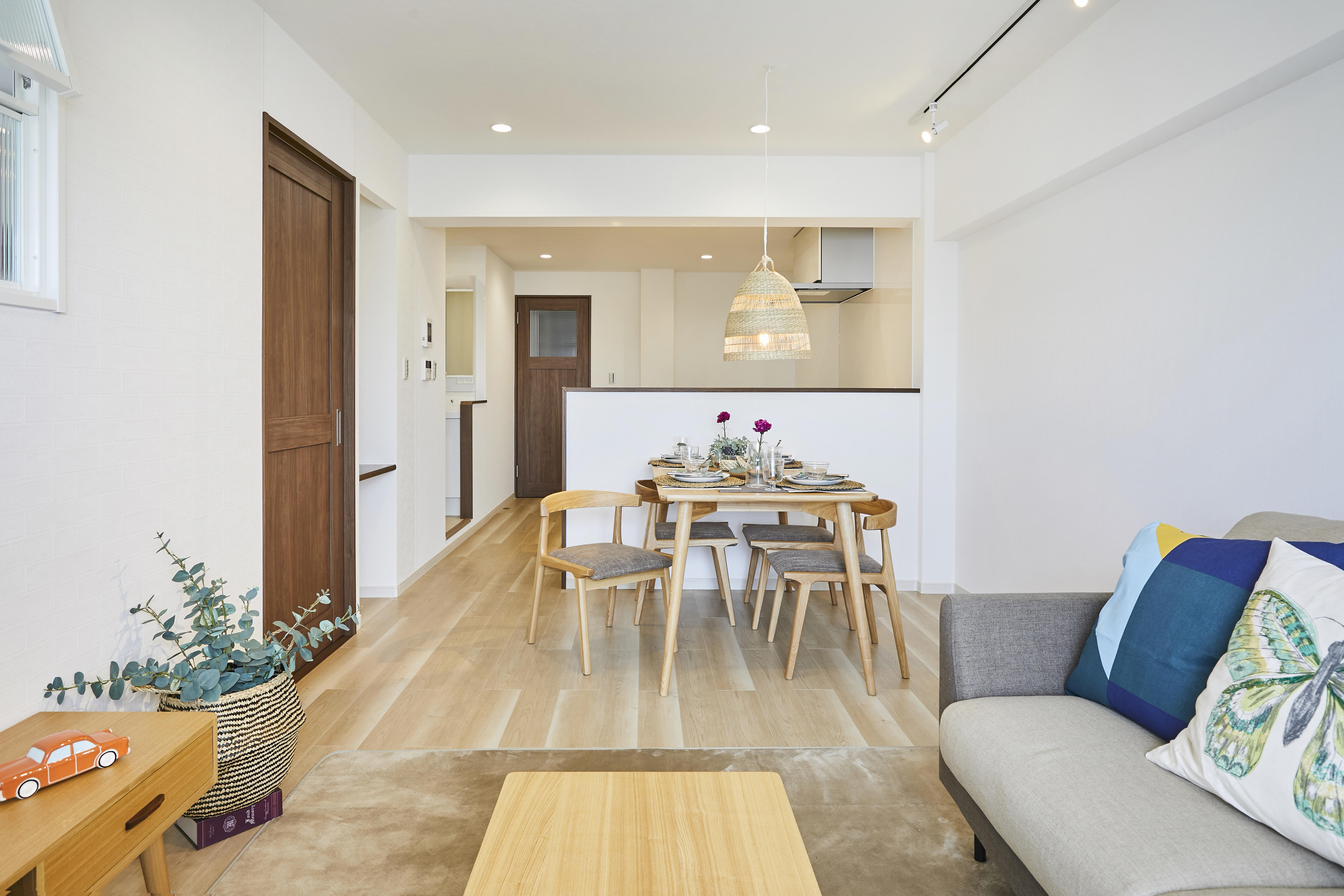 築39年のマンションをフルリノベーション。施工前は独立型のキッチン・バランス釜の浴槽・脱衣所の奥にトイレが設置されている間取りでした。各部屋に物置があり、ホワイトの建具ですが年代を感じる内装です。リビング横には和室があり、襖で部屋が仕切られていましたが、洋室にしてデコマドを設置。南向きのリビングから差し込む光とオープンなL型キッチンにしたことで、明るく風通しのいい空間に。さらにキッチンとサニタリースペースを隣接させて、スムーズな家事導線を設計。家族とのコミュニケーションが増えるオープンなお住まいに大変身しました。