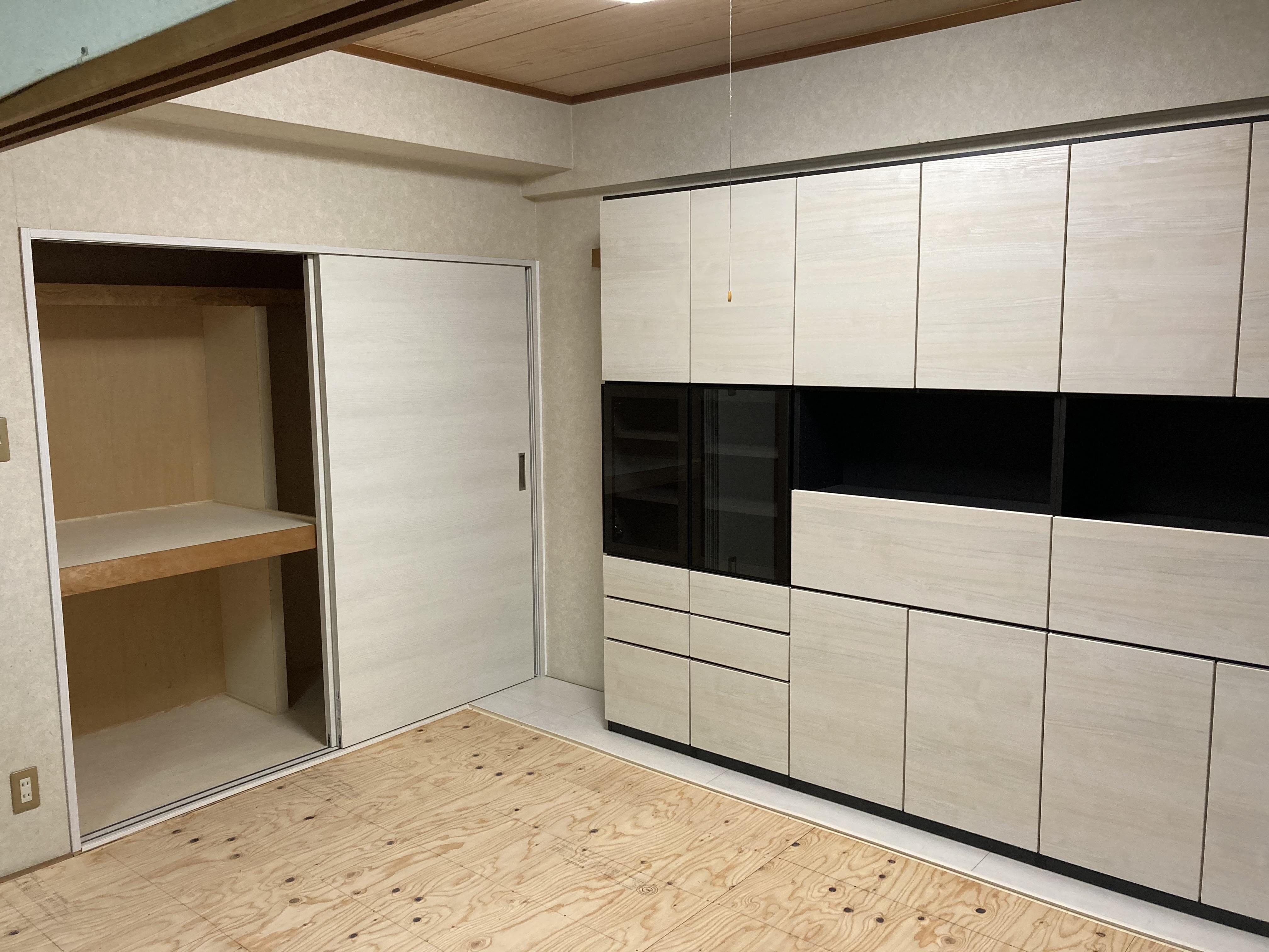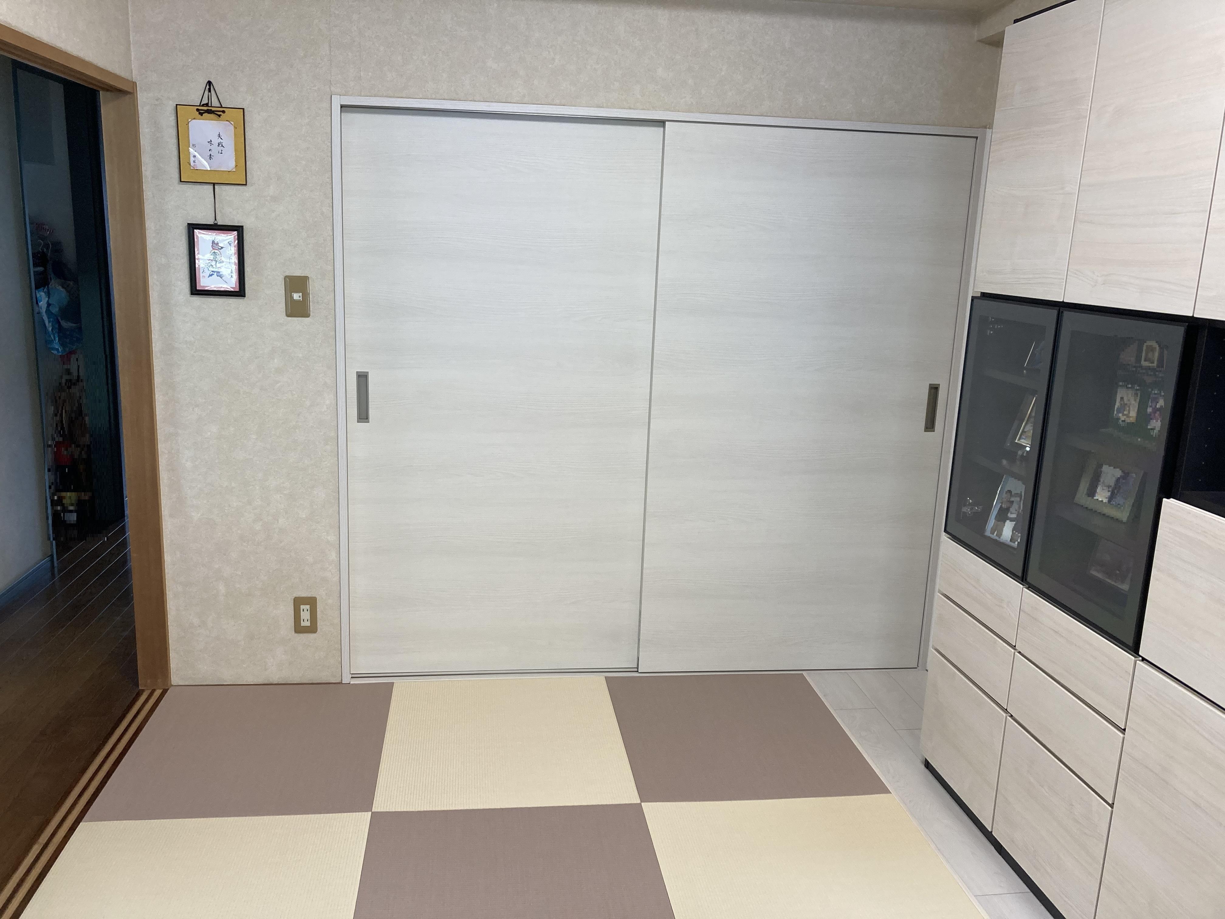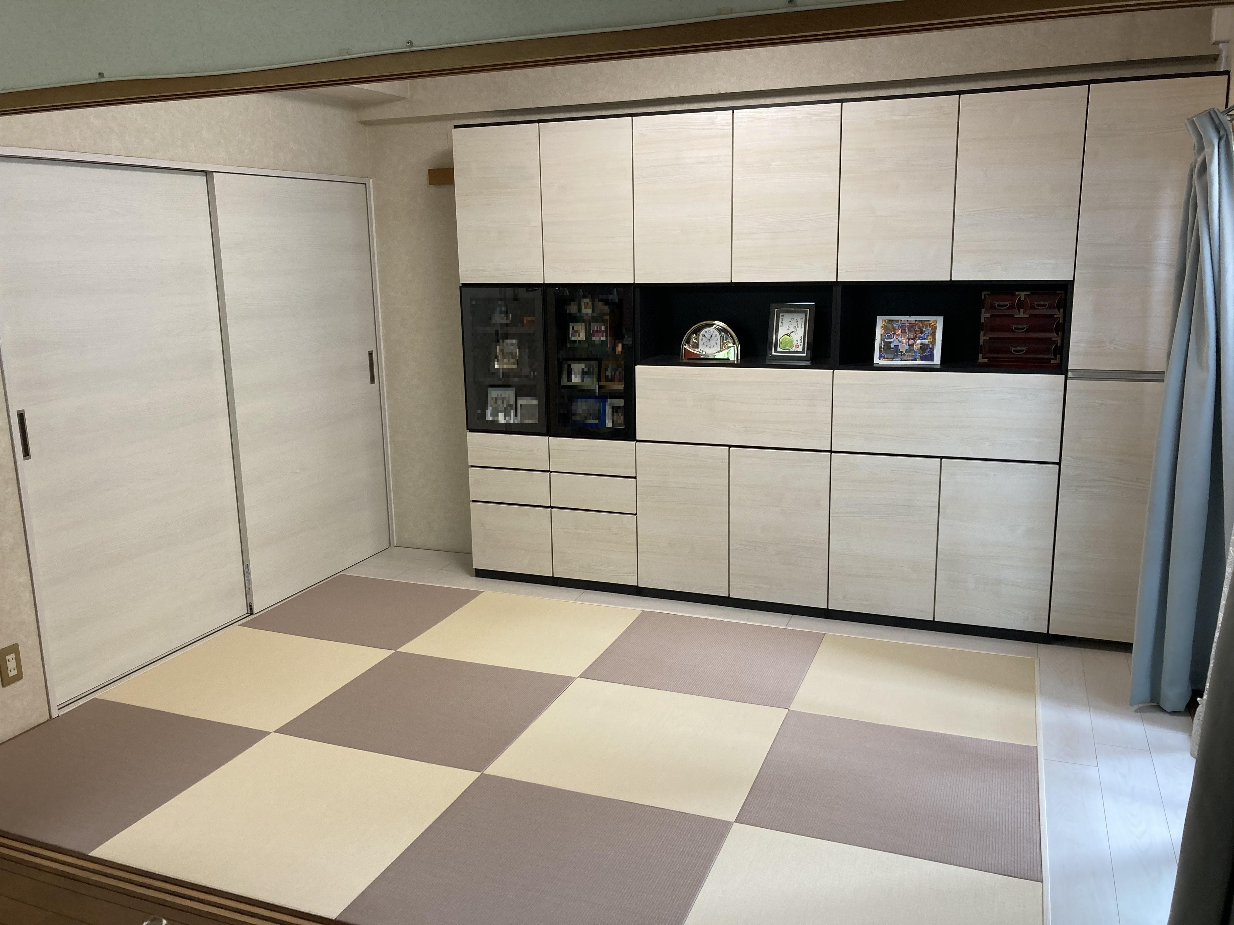 この度はご依頼いただきまして誠にありがとうございました。壁面収納はDAIKEN「MiSEL」を使用しました。システム収納なのでお部屋に合わせて機能やサイズをカスタマイズできます。インテリアに関心が高い方に人気の商品で、弊社でも施工させて頂く事が多くございます。また和室リフォームの際に縁なし畳のご依頼もよくいただきます。今回はピンクとアイボリーの2色をお選びいただき市松模様に仕上げていきました。収納性が高まり、おしゃれな和室になり嬉しく思います。至らぬ点が多々あったかと思いますが、寛大なご処置を賜り心よりお礼申し上げます。今後ともご愛顧のほどよろしくお願いいたします。