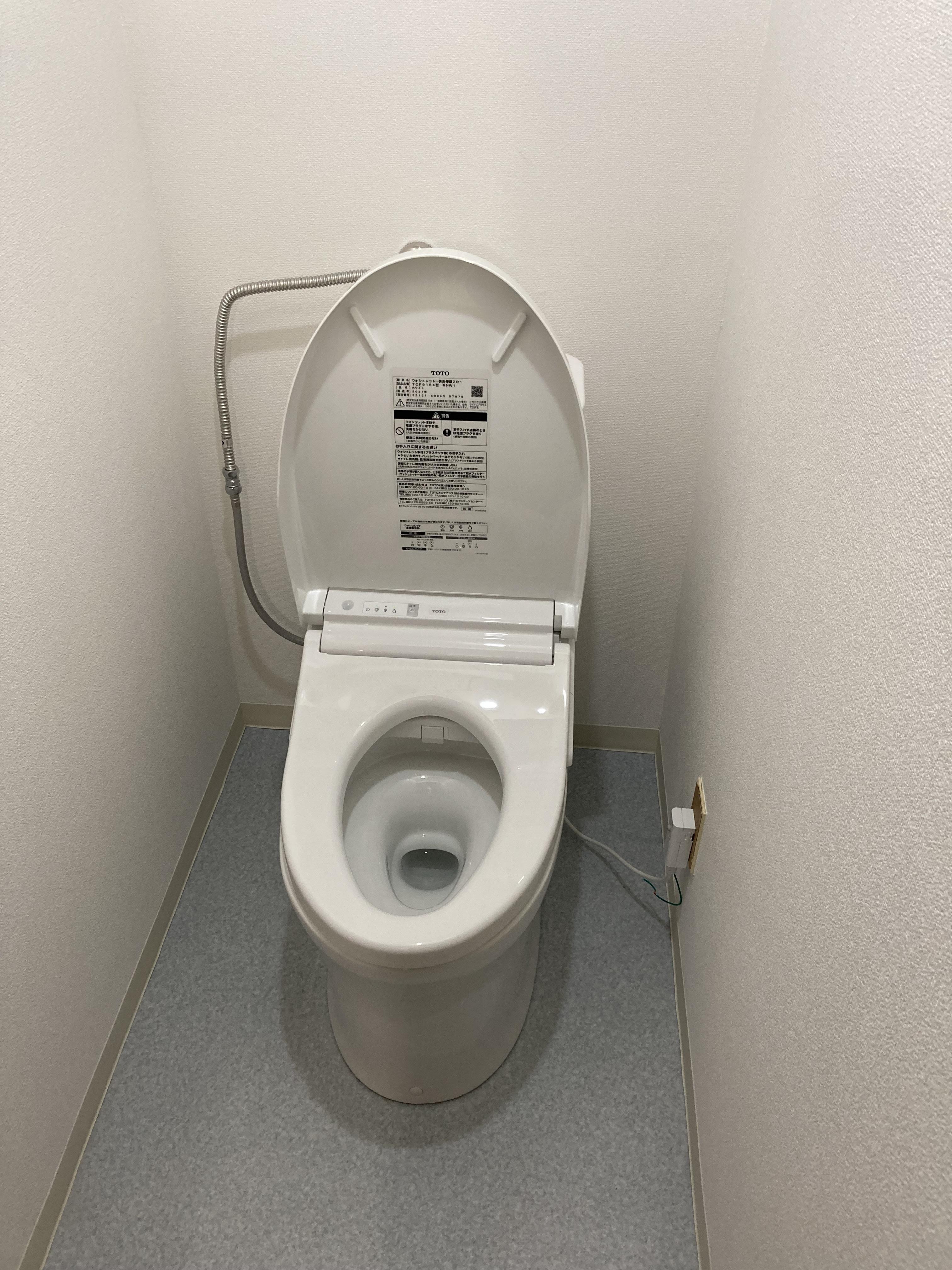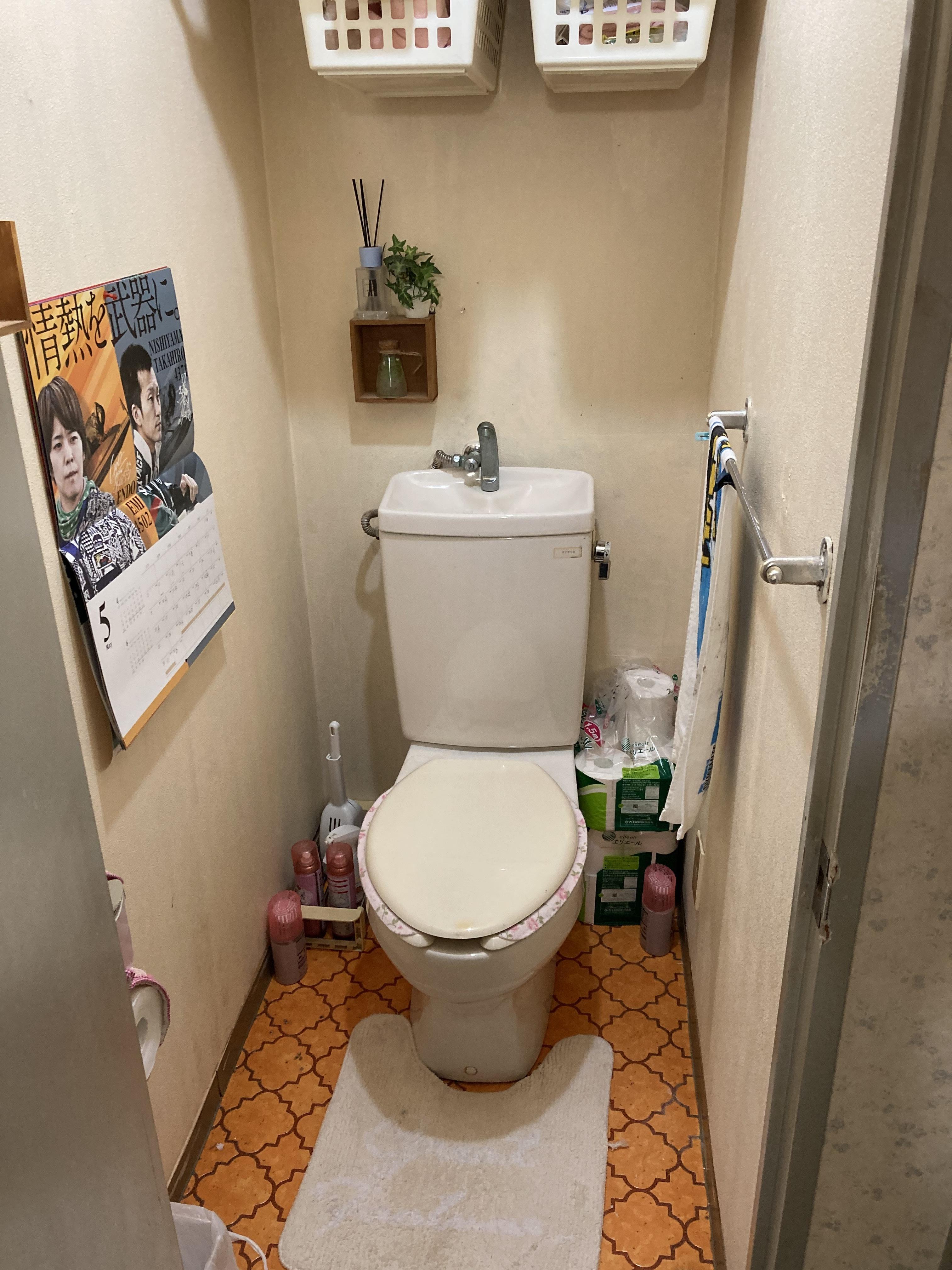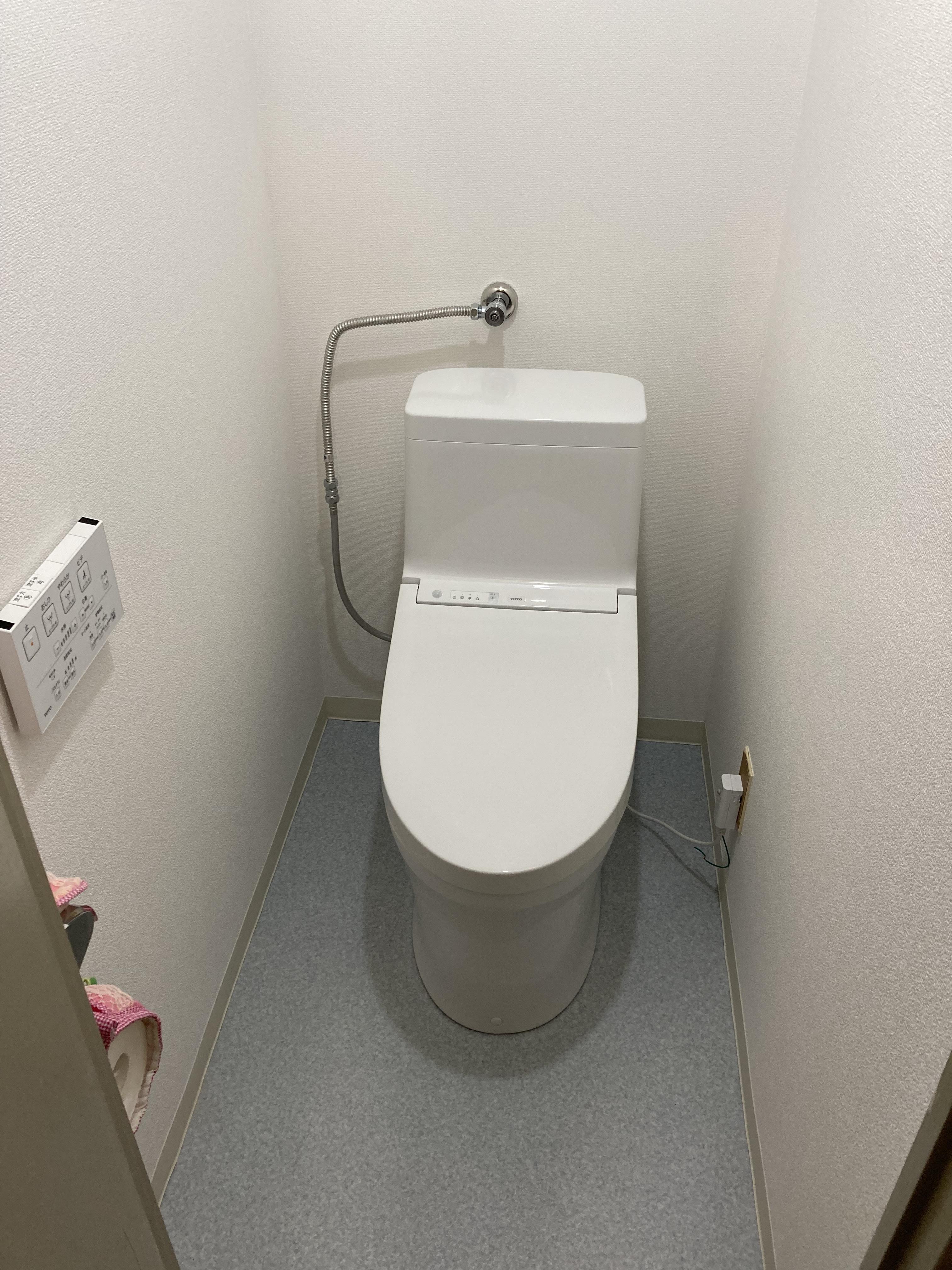 築41年マンションのトイレリフォームです。トイレ本体と古くなった内装交換のご依頼を頂きました。お施主様のご希望で本体はTOTOのウォシュレット一体形便器に交換。内装はホワイト調のものをお選びになられ、明るいトイレ空間になりました。