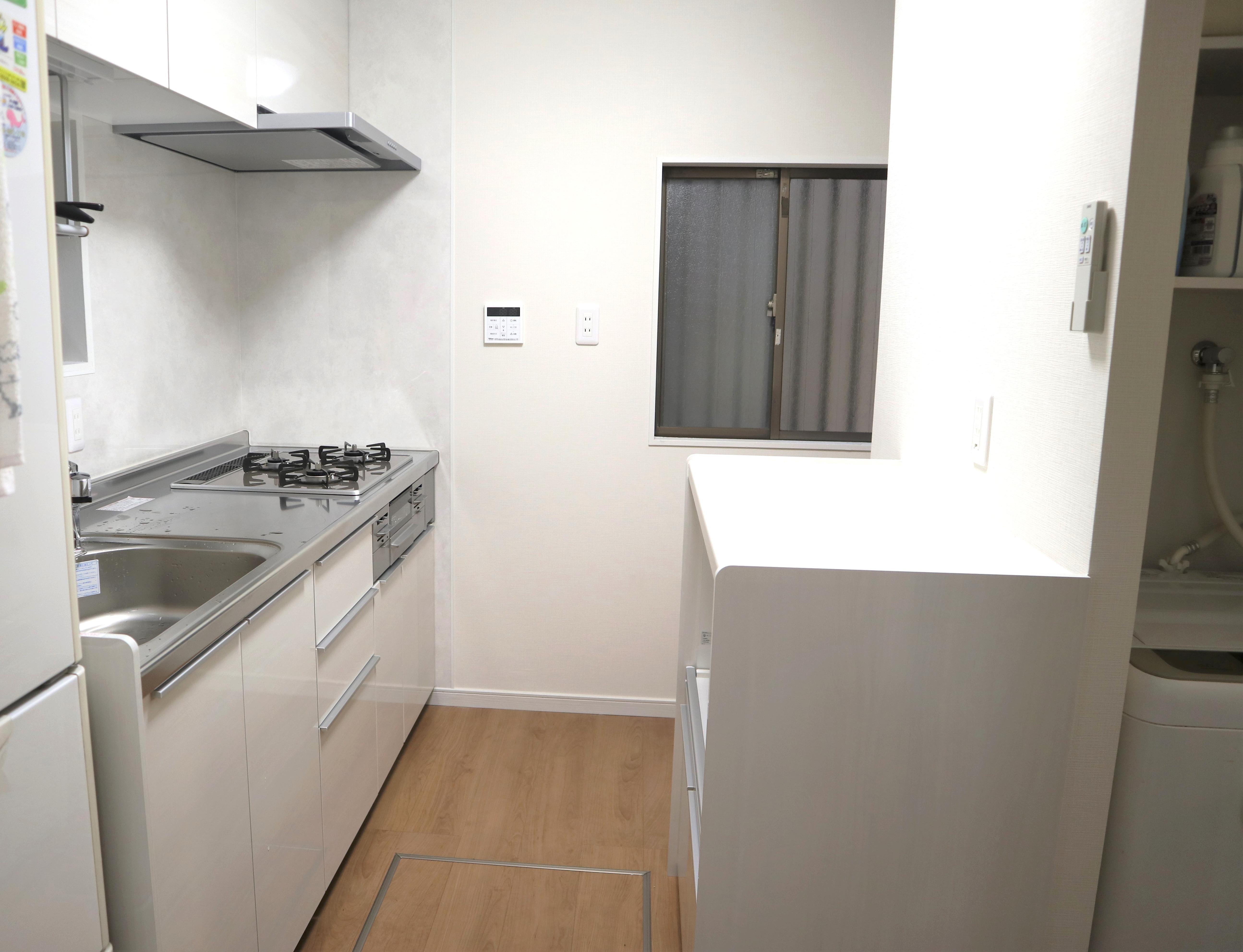 築55年になる戸建のワンフロアをフルリノベーション。35年前にリフォーム済みでしたが、リビングの床がずいぶん前からへこんでいるとお悩みでした。そこで水まわり設備の交換、内装リフォームだけでなく、床の下地から浴室の基礎工事など、下地部分の補修等も行いました。既存の間取りを活かしつつ、水まわり空間に間仕切りを造作し、以前より使いやすいお住まいを提案。全体的に明るいお色の素材を選び、明るく広々とした雰囲気に生まれ変わりました。