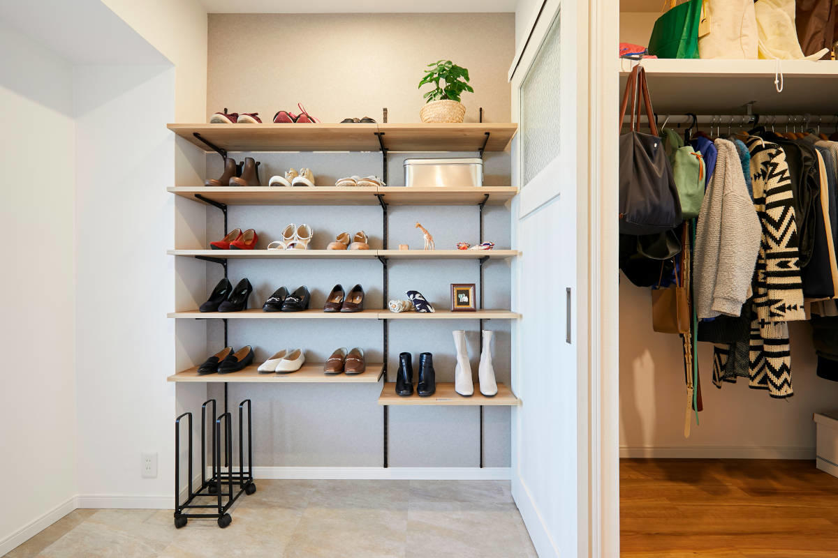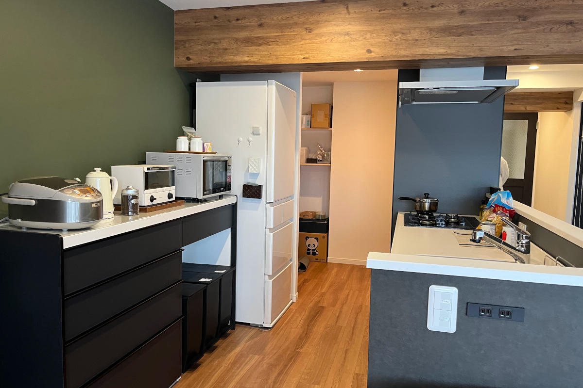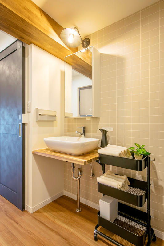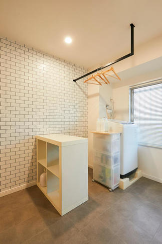 また、玄関脇の洋室だった場所をユーティリティールームに変更。壁一面にタイル風のクロスを貼り、まるで外国のおしゃれなランドリールームのような雰囲気に。T様にも「すごく気に入っています」と大変喜んでいただきました。