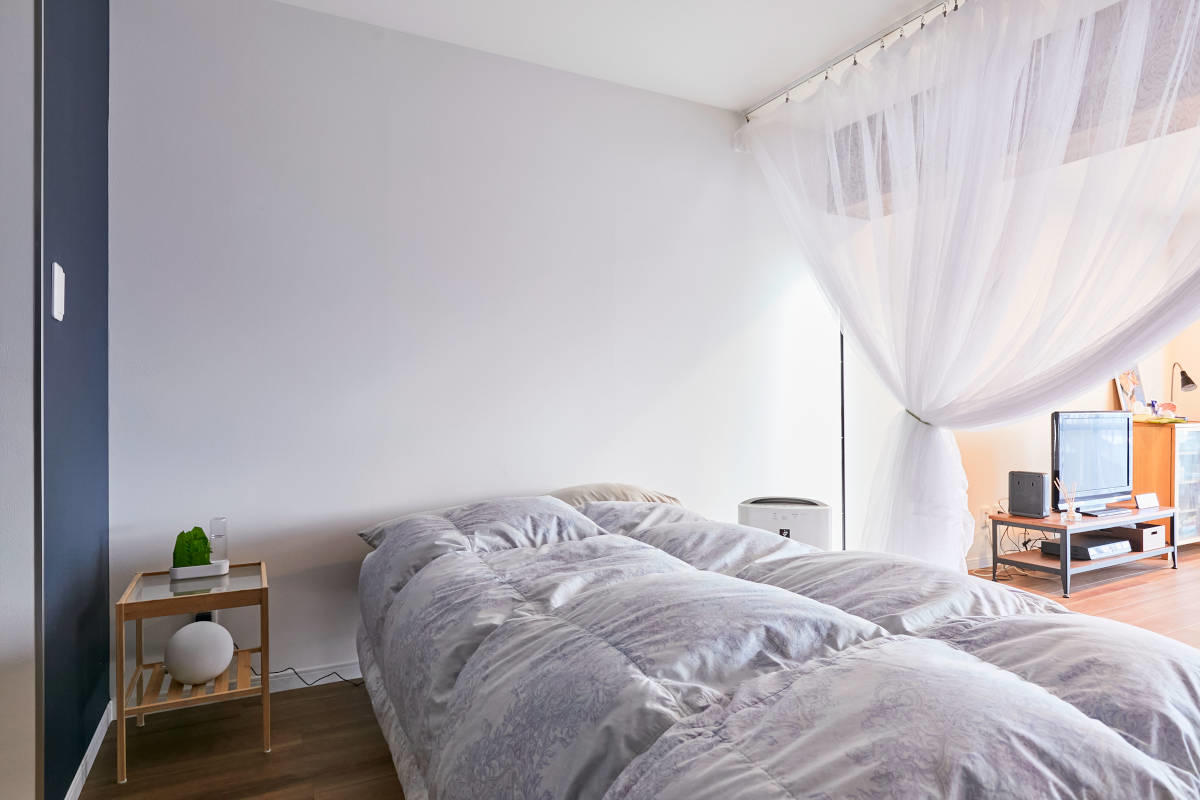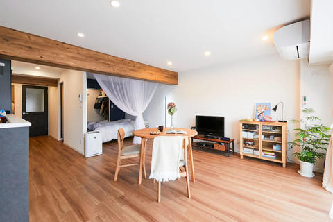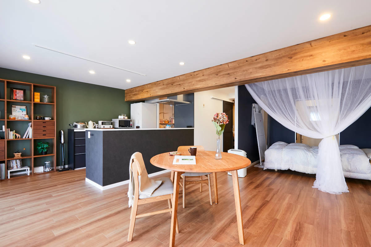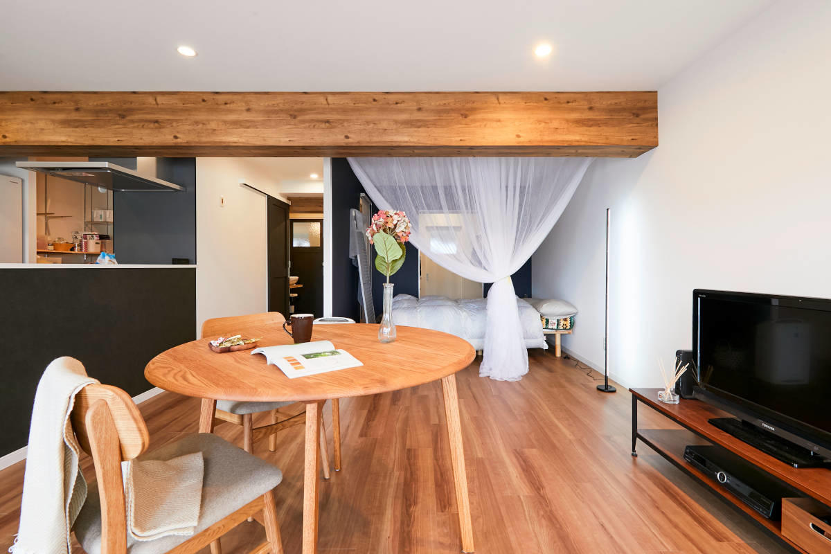 寒い思いをしたくない、というご要望を受け、もともと3LDKだった間取りを大幅に変更し、ワンルーム風にリノベーションしました。大きなベランダからたっぷり入るお日様の熱で、LDK、ベッドルーム、トイレ、どこへ行くにもポカポカの状態をキープできるよう配慮しました。ベッドルームはWIC(ウォークインクローゼット)、土間と扉ひとつでつながっており、着替えたらすぐに出かけられるという動線の良さも特徴です。