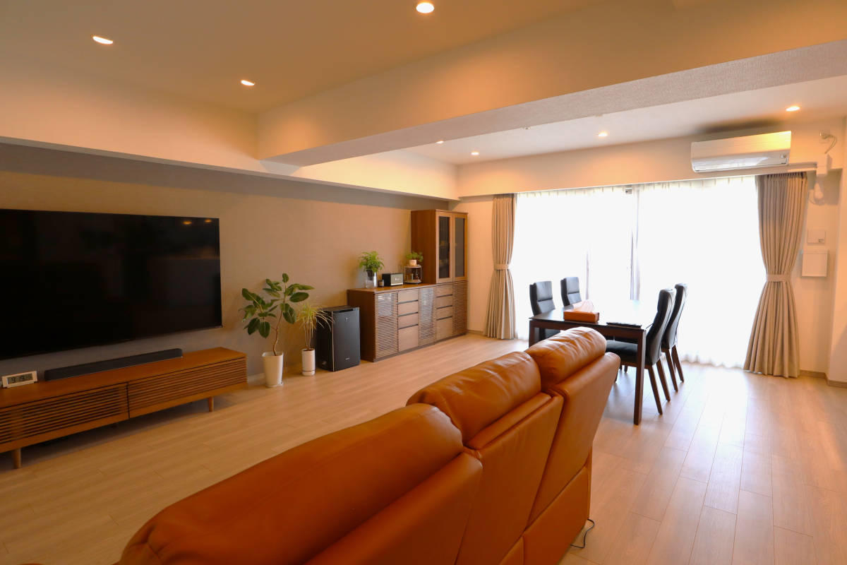 築17年、約100㎡の4LDKの中古マンションをリノベーションされたH様邸。ご夫婦とお子様おふたりというご家族構成で、以前お住まいだったお家が手狭だったため、新しいお家はとにかく広がりのある空間にしたいというご要望をいただきました。インテリアの色や取手などのパーツ、照明の色味など、細部にわたってじっくりと吟味され、ショールームにも足しげく通われました。