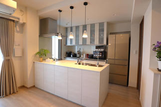 とにかくお部屋を広々と…というご要望を受け、リビングに隣接していた和室を解体し、ひと続きの大きなリビングダイニングに間取りを変更。天井も解体し、可能な限りギリギリまで天井高をあげました。圧迫感が出ないよう、照明も凹凸が少なくスッキリと見せられるダウンライトを中心に構成しました。また、こだわりのひとつだった色に関しても、壁や収納の建具、キッチンのパネルなどを白で統一することにより、一体感と広がりをもたせています。