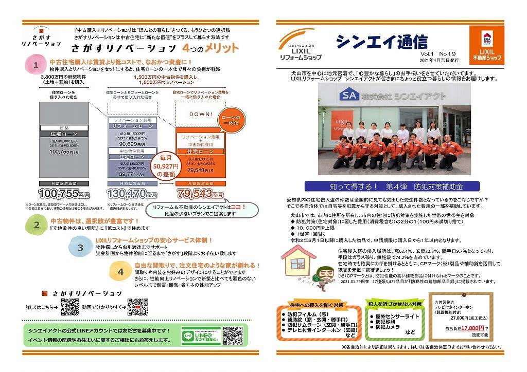 定期的に発行しているシンエイ通信、今回は『犬山市防犯対策補助金』&『中古住宅+リノベーション さがすリノベーション』について
