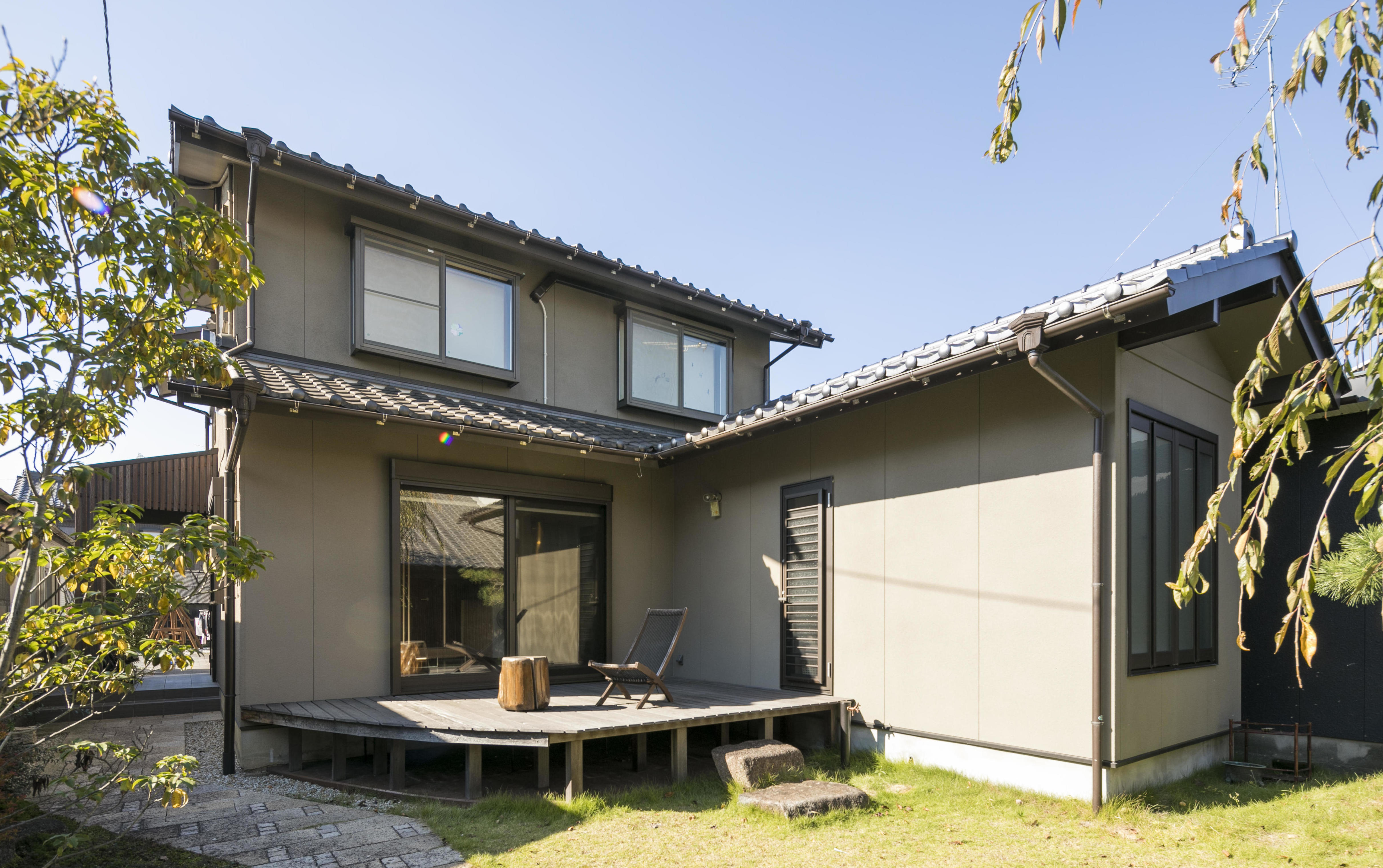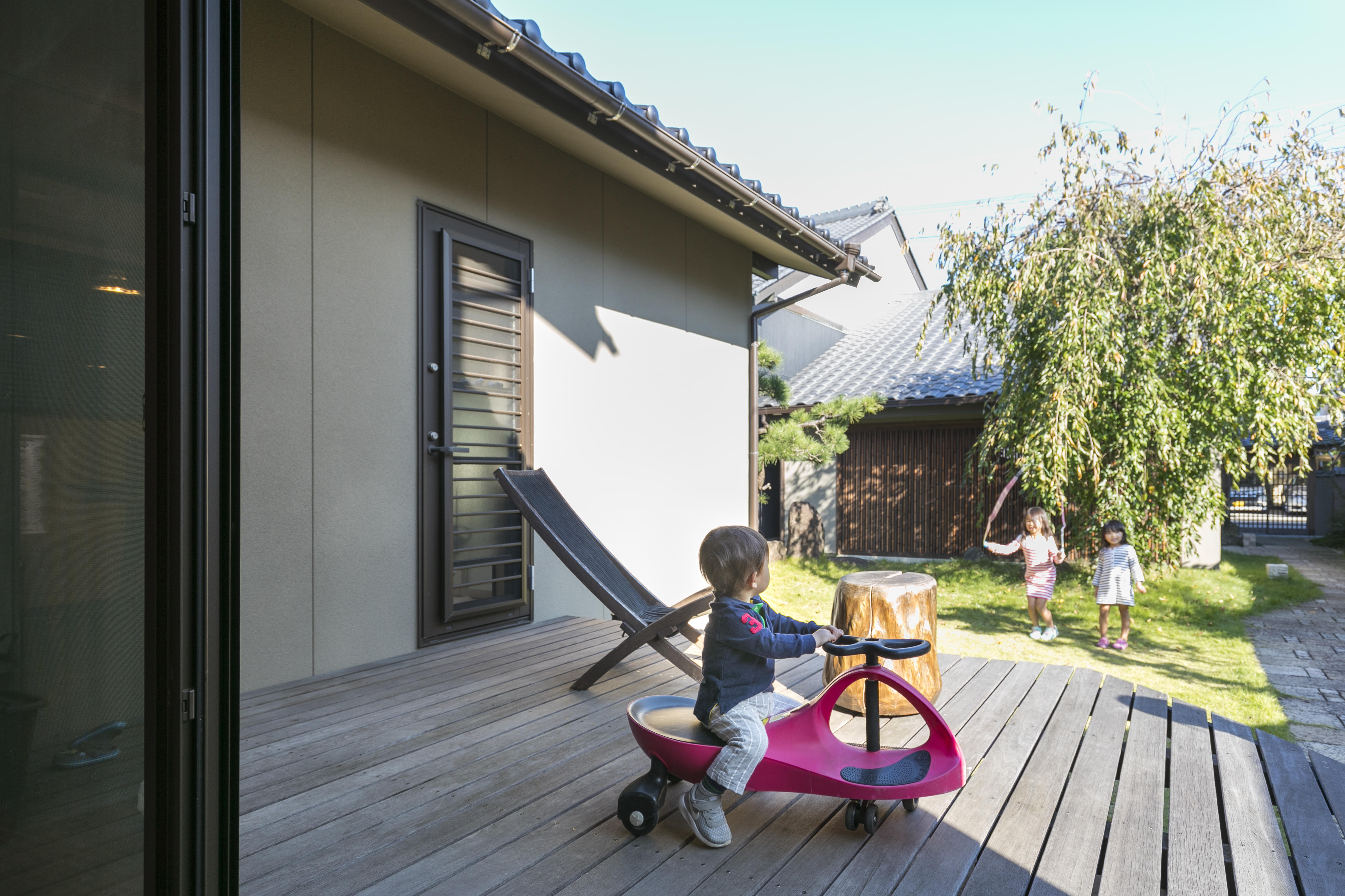 昭和の時代の間取りだった住宅をフルリノベーションしました。LDKやトイレ、洗面や浴室など普段よく使う部分をLDKの周りに配置し、仲良し家族の気配が感じられる間取りとなっています。キッチンやトイレには部分的にタイルを採用することによりワンランク上の空間に仕上がっております。土地が広く、従来は貸し駐車場としていましたが、貸し駐車場をやめ車庫と庭を配置することにより、とてもプライベート感の高い中庭が出来ました。大き目のウッドデッキがリビングとお庭をつないでいます。