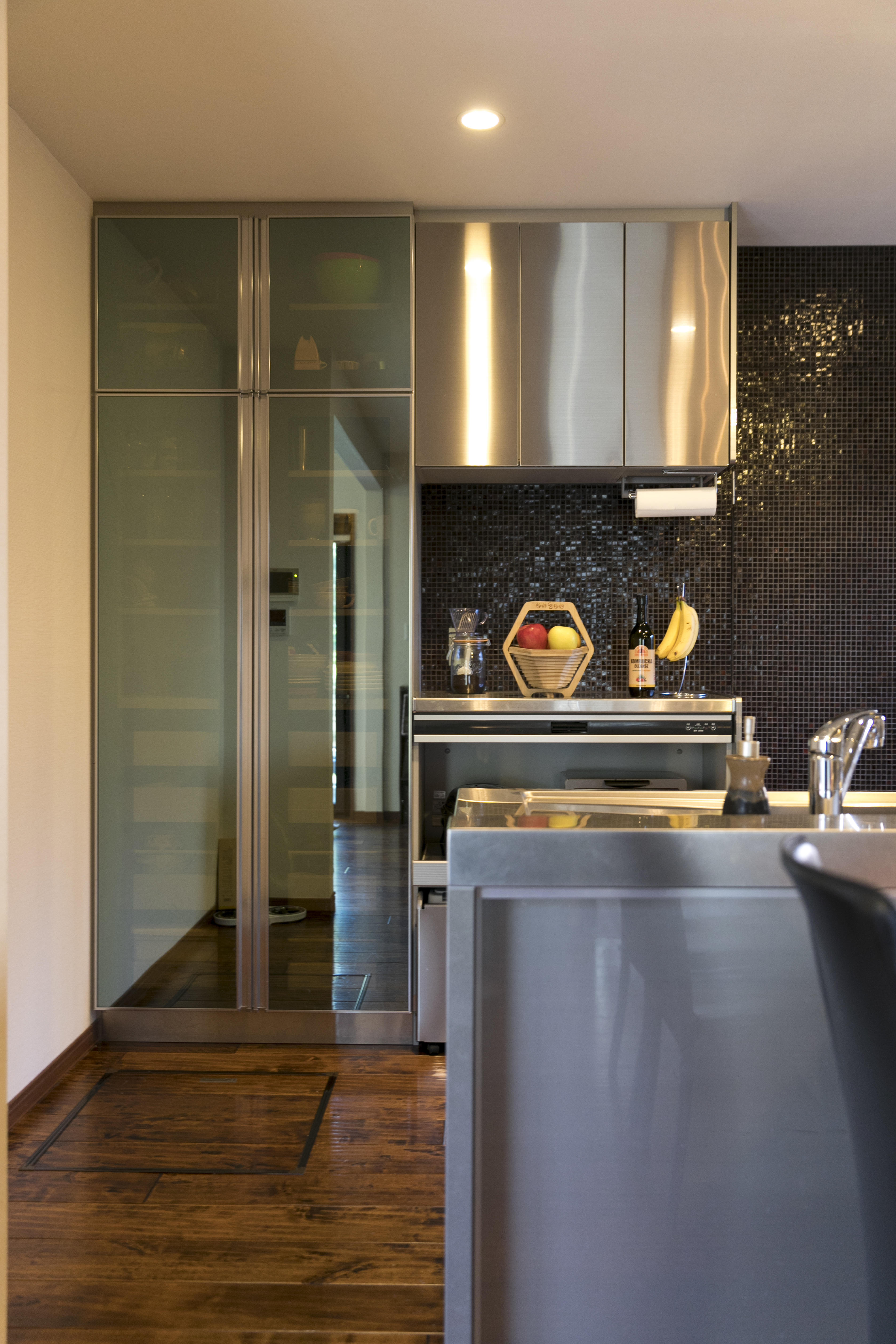 築25年の中古住宅を一部増築し、水廻りの配置もすべて変更し、全く新しい住まいにリノベーションしました。昔ながらの配置で狭くて寒かった脱衣室と浴室を思い切ってLDKに繋げて増築し、大きな浴室窓を開ければ露天風呂のような気分が味わえます。間取りの都合上キッチンは小さめですが、壁と一体にガラスモザイクタイルを貼った目立たないドアの奥にはゆとりのパントリーを設けています。