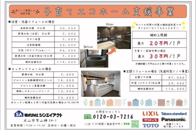 お風呂、キッチンも補助金が出ますので詳しくは下記チラシをご覧ください。