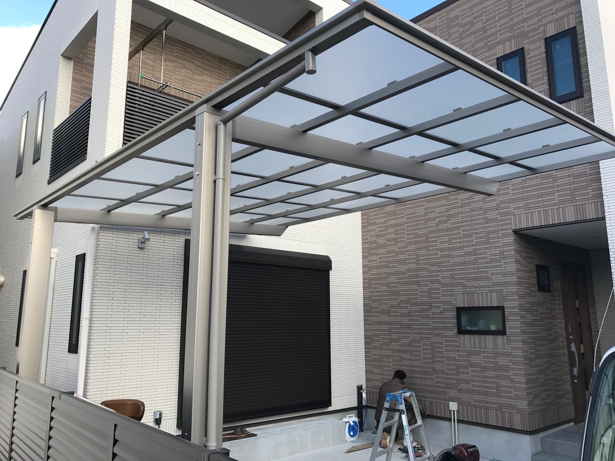 『お客様のご要望』1台分のカーポートから、敷地いっぱい2台分に広げて欲しい。 『リフォーム工事後』フーゴFで風に強く、フラット屋根なのですっきりしている。