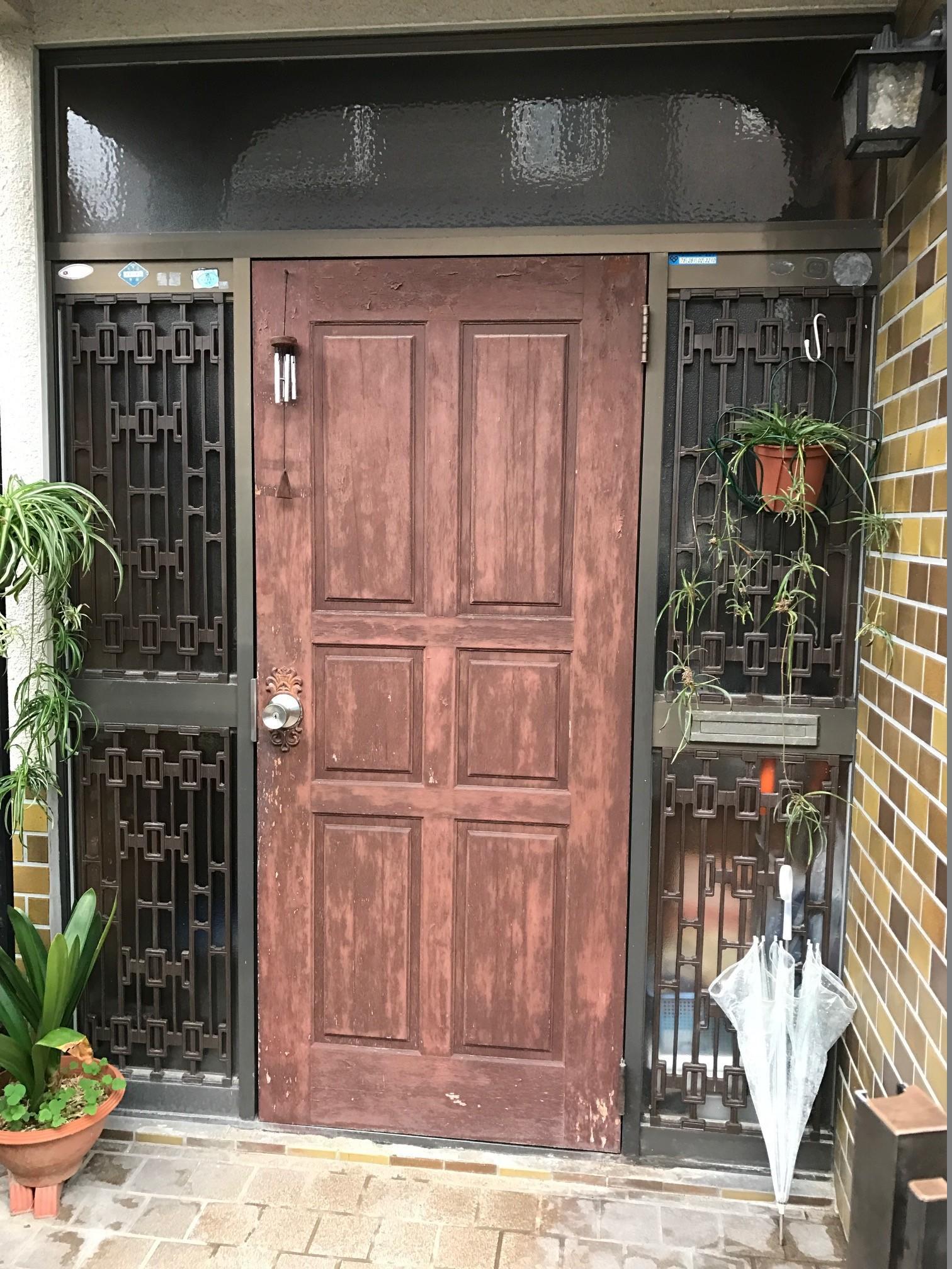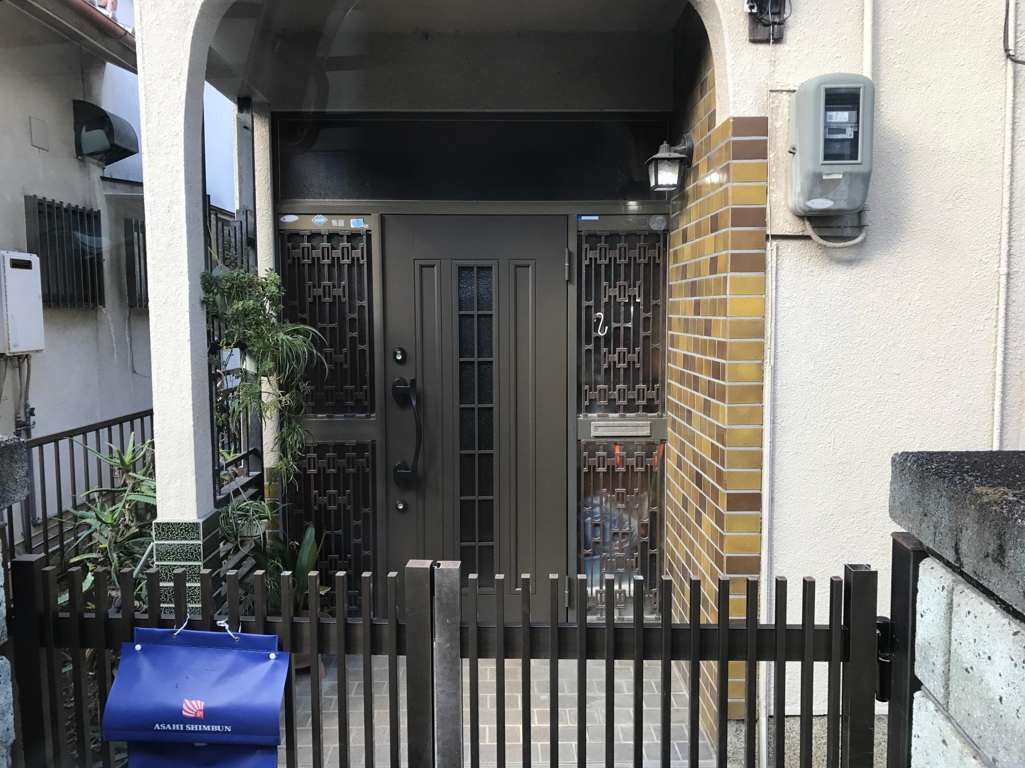 『お客様のご要望』玄関の開閉しづらくなったので、軽いドアに交換して欲しい。 『リフォーム工事後』本体はアルミで軽く、ガラス面があるので明るい。セキュリティーサムターンが付いていて、防犯性も向上。