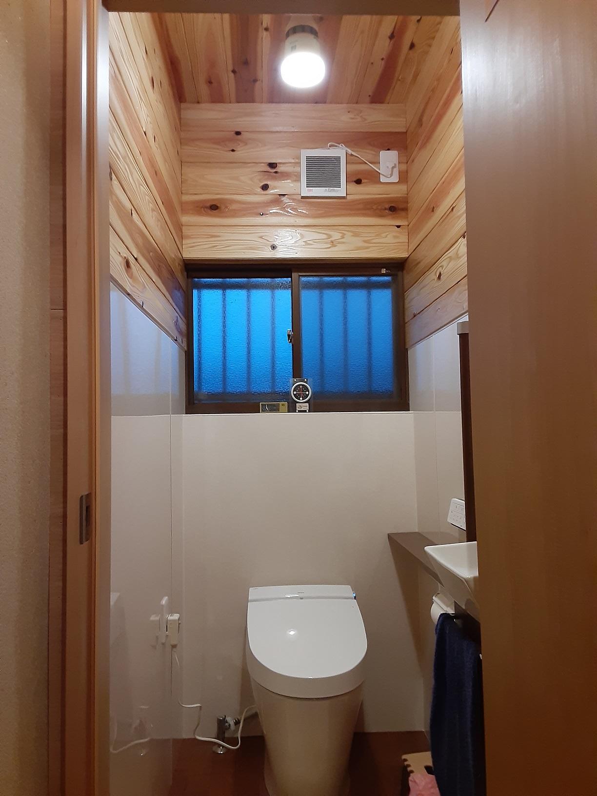 壁の下部は掃除しやすいパネルを、上部には木目を生かした森にあるコテージ風の温もりあるトイレになりました。