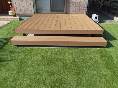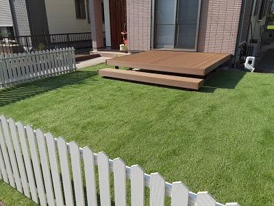LIXIL 樹ら楽ステージ 木彫 防食やシリアリの心配なし、防草シート+人工芝でお手入れフリー、ストレスフリーなお庭になりました。 新しいお庭でおうち時間を楽しんでくださいね。 ウッドデッキ(人工木デッキ)やフェンスなどのエクステリアのお悩みがありましたらワケンまでご相談下さい。