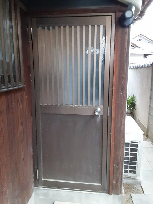 「勝手口が古く、格子も外れてくるので新しいものにしたい」とご相談頂きました。 本体の吊り替えのみなので、工事が1時間ほどで完了です。 上部に防犯ガラス、アルミ格子を取り付けています。