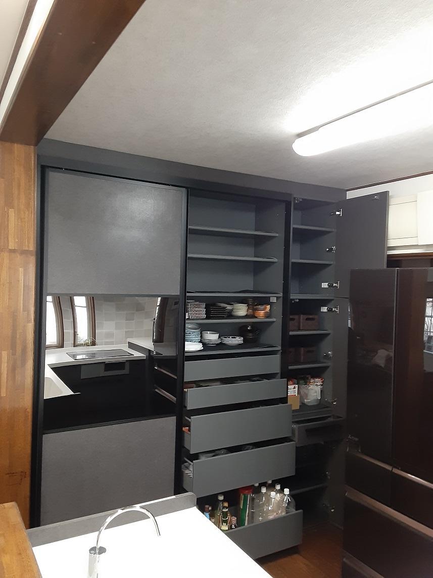 壁面全体が収納になる大型のキッチンクローゼットを採用され、食器から食品ストックまでたくさん収納することが出来ます。