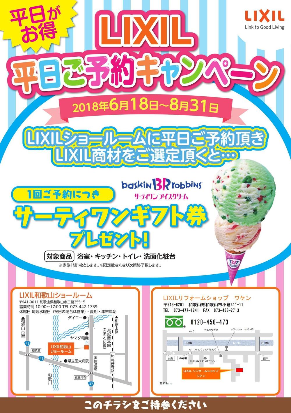 LIXIL和歌山ショールームでは平日ご予約頂き、LIXIL商材をご選定頂くと1回ご予約につきサーティーワンギフト券をプレゼントしています。